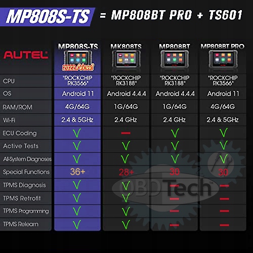 Autel MP808S-TS 2023 года выпуска, это MS906+TS601. Модернизированный MP808TS, сканер Autel MaxiPRO MP808S-TS, находится в аналогичном ценовом диапазоне с MP808TS и обладает всеми функциями MP808BT PRO + MS906 + TS608. Полностью обновленное оборудование обеспечивает быструю ежедневную диагностику. Будучи самым экономичным профессиональным сканером Autela на 2023 год, MP808S-TS предлагает кодирование ЭБУ, около 36 сервисных функций, активные тесты, диагностику всей системы оригинального оборудования, полные функции TPMS и более 10 расширенных функций.