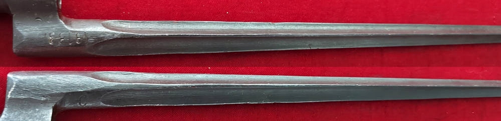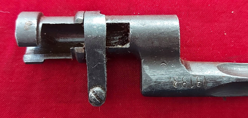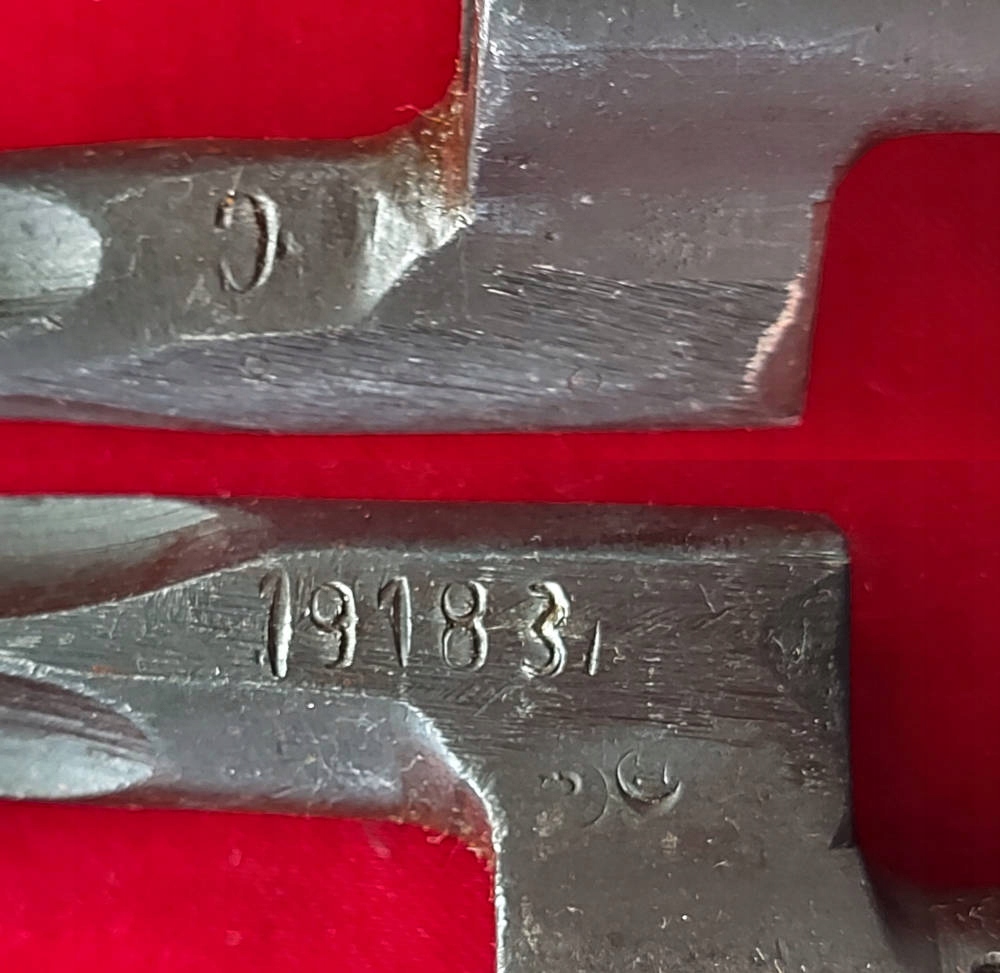 Экземпляр, видимый на фотографиях, очень хорошо сохранился, но плохо сделан. Кольцо подвижное. На штыке виден номер 19183, а внизу — слабые подписи. На пороге клинка выбита заглавная буква С.
