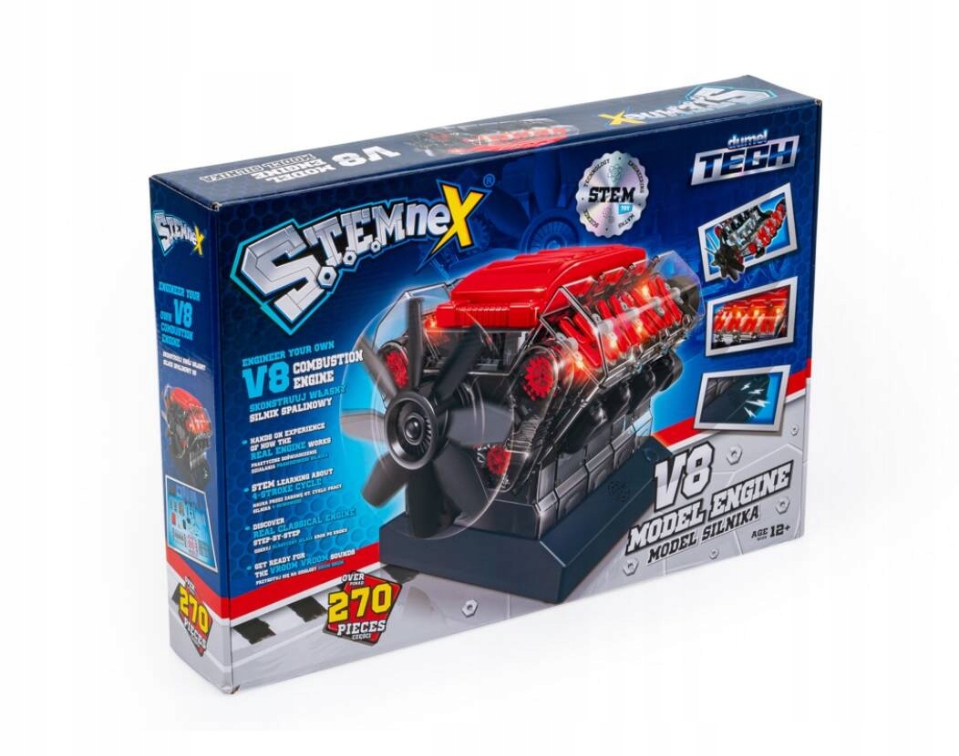 Узнайте, как работает 4-тактный двигатель, и соберите его самостоятельно! Большой набор состоит из целых 270 элементов, которые при правильном соединении создадут модель двигателя V8. Когда вы вставляете батарейки (не входят в комплект), двигатель запускается и издает реалистичные звуки! Наблюдайте, как он работает, и учитесь, играя. Товар предназначен для детей от 12 лет.