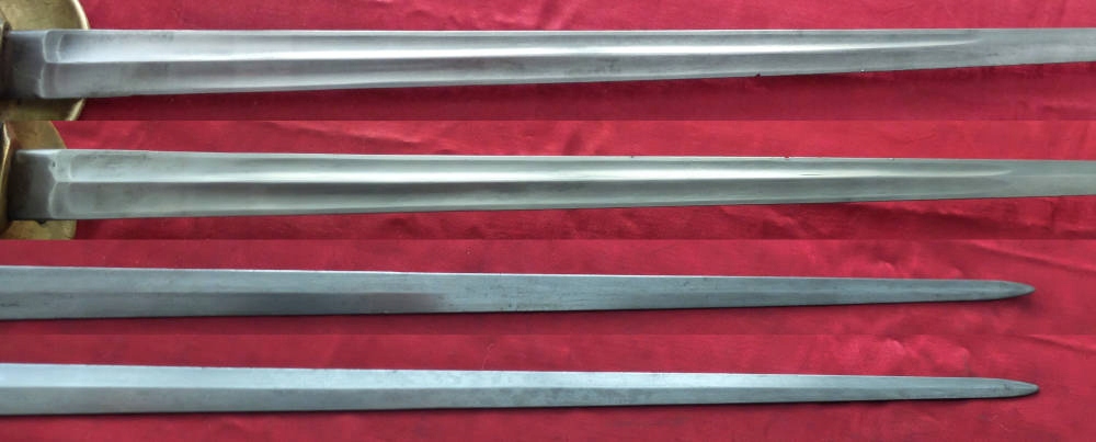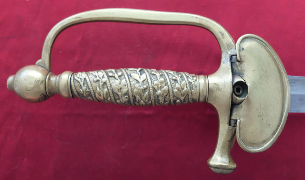 Копия видна на фотографиях. Лезвие не заточено и не заточено. Корпус рукоятки и стержень изготовлены из латуни. Одна защитная пластина шарнирная, но без замка. Рукоять свободная.