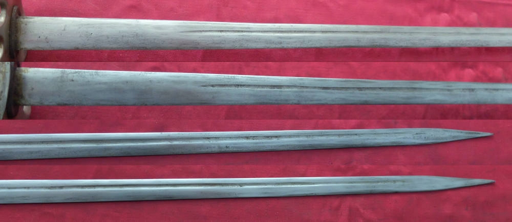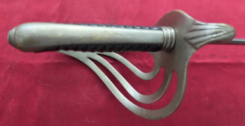 Копия видна на фотографиях. Клинок покрыт патиной, клинок укорочен. Стержень ручки роговой. Оригинальная тесьма полностью сохранилась. Под крестовиной имеется оригинальная кожаная накладка. Корзина цевья имеет небольшой люфт.