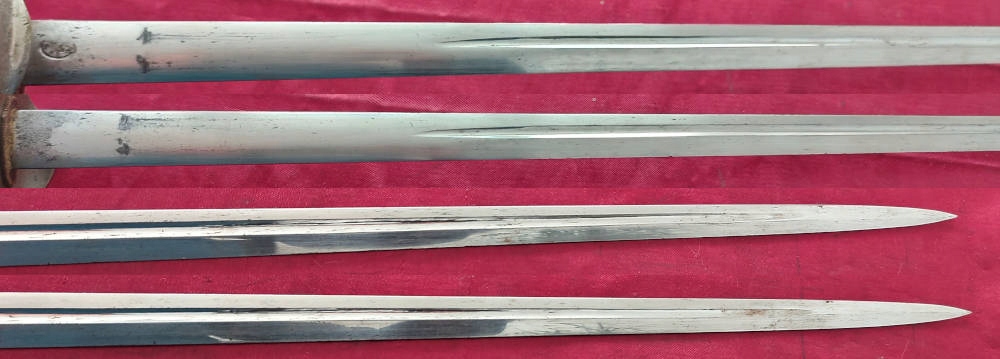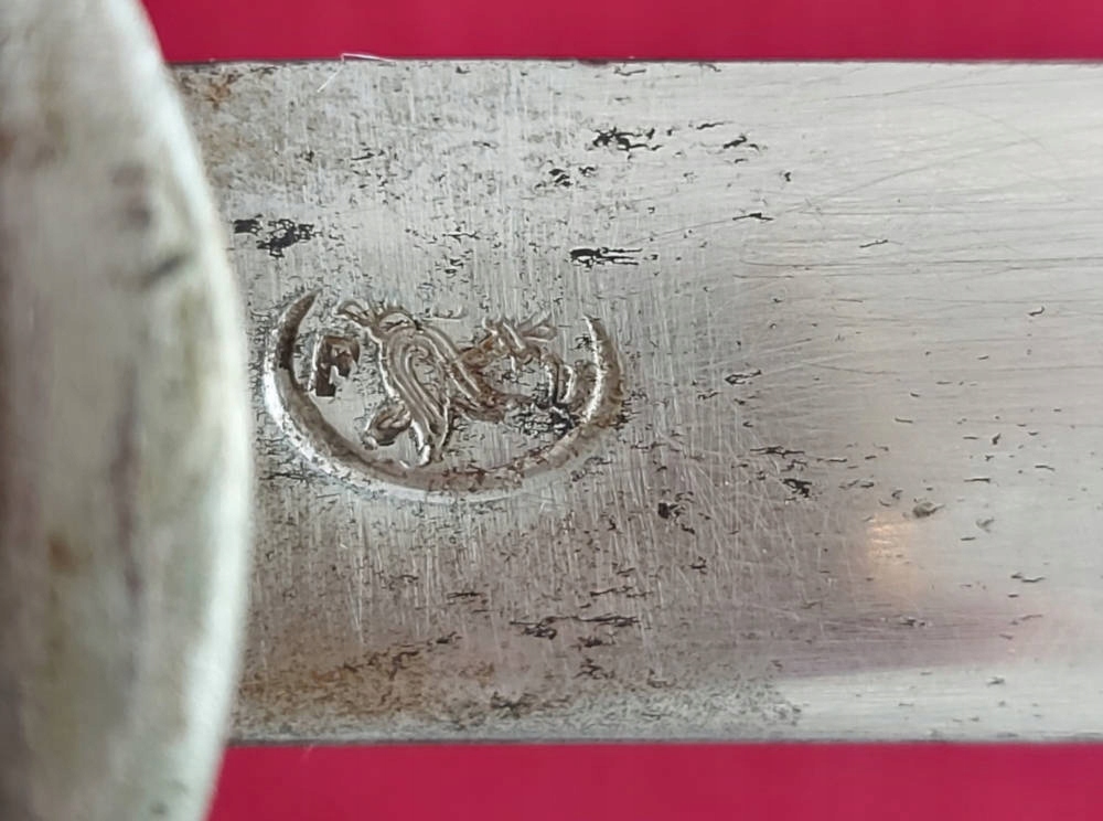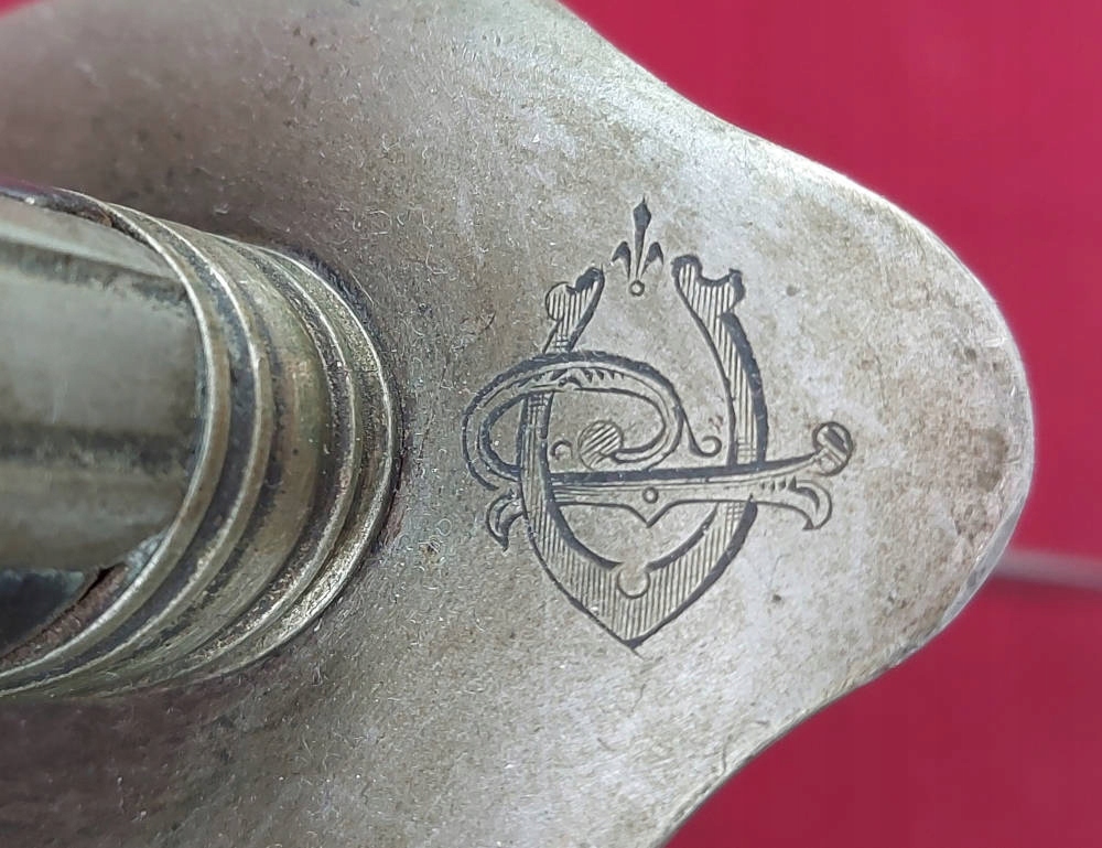 Копия видна на фотографиях, она прекрасно сохранилась. Клинок не заточен, не заточен, сохранено 99% исходного хрома, имеется небольшая утрата в районе крестовины. На краю лезвия имеется подпись. Стержень ручки роговой, оплетка отсутствует. Под крестовиной имеется оригинальная кожаная накладка. На перекладине с тыльной стороны рукояти буквенный вензель - переплетенные буквы CP. Корзина крестовины не имеет большого люфта, но при встряхивании не двигается.