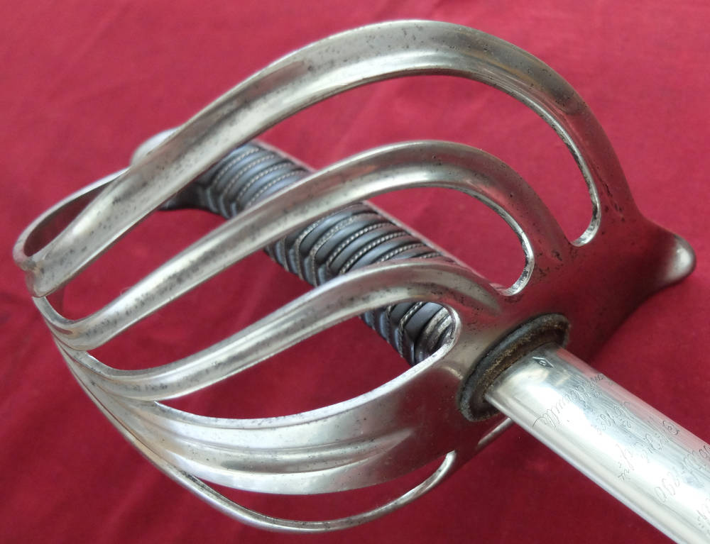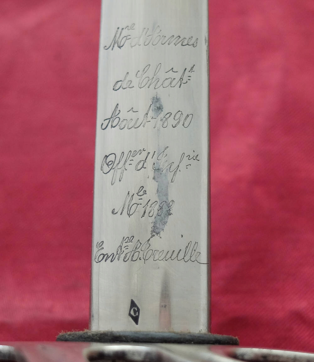 Экземпляр, видимый на фотографиях, очень хорошо сохранился. Лезвие не заточено, не заточено и на 99% состоит из оригинального хрома. На пороге клинка небольшое клеймо и надпись: Шательро мануфактура, модель 1882, год выпуска 1890. Стержень рукоятки роговой, сохранилась оригинальная оплетка. Под крестовиной имеется оригинальная кожаная накладка. Ручка не сломана, люфтов нет. Рядом с навершием выбито число 92, а на цевье видна буквенная монограмма.