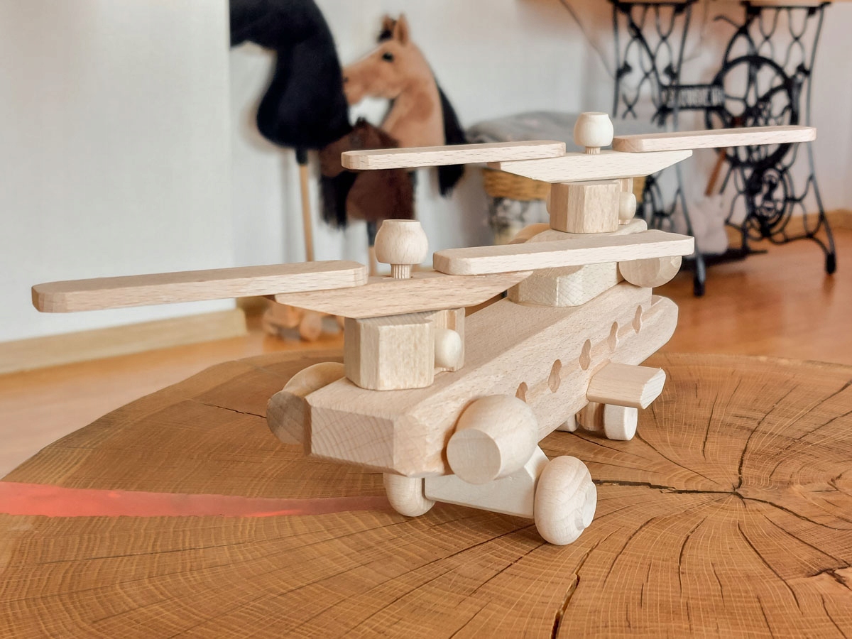 Модель ручной работы из массива дерева, стилизованная под вертолет Boeing CH-47 Chinook.
