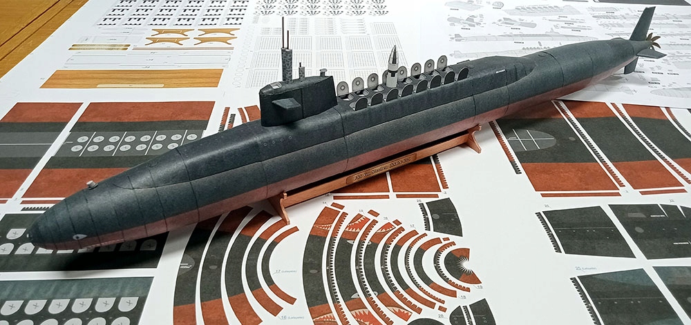 Модель в картонной упаковке № 5/2021 Американская подводная лодка USS Von Steuben/Lafayette. Одна модель может быть изготовлена из одного экземпляра в двух вариантах окраски (1- Фон Штойбен 2- Лафафет). Включает подставку для модели и 16 баллистических ракет «Поларис», которые можно разместить в открывающихся шахтах).