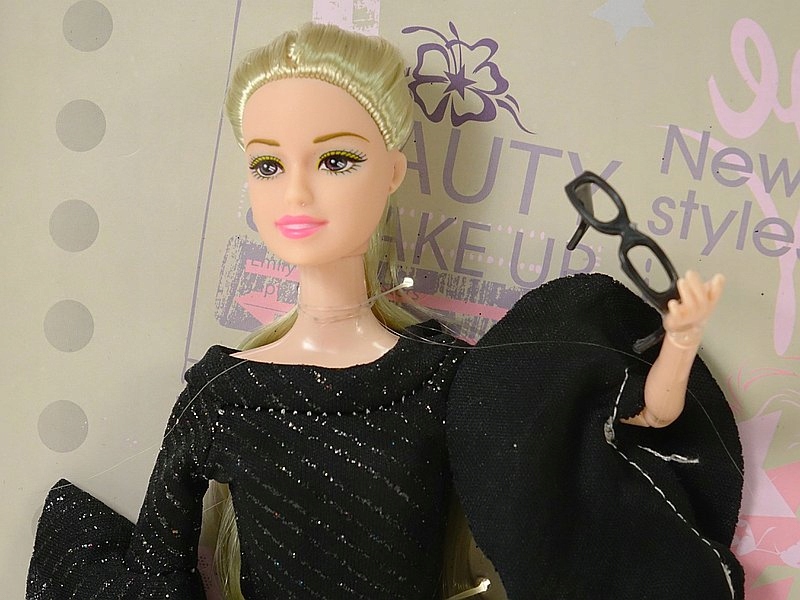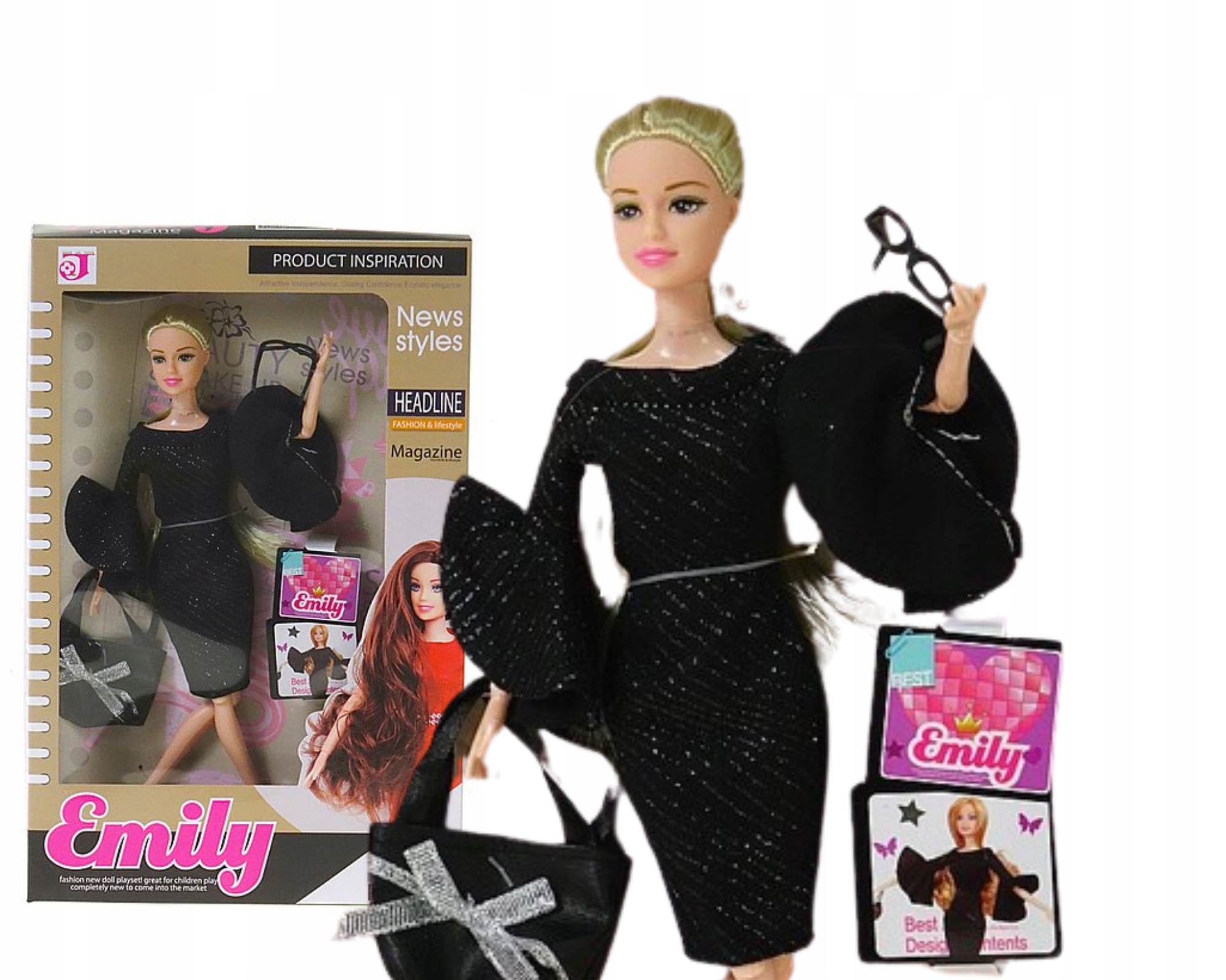 МОДЕЛЬ ЛЯЛЬКА ЕМІЛІ, ЕЛЕГАНТНО ОДЯГНЕНА, СУКНЯ, СУМКА, ОКУЛЯРИ, ІГРАШКА