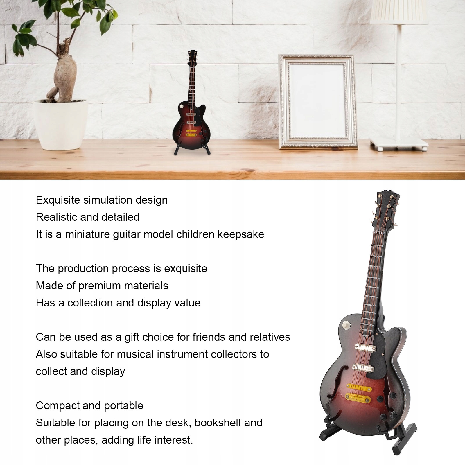 1. Реалистичная и нежная: модель миниатюрной гитары имеет прекрасно смоделированный дизайн, реалистичный и нежный, что делает ее очаровательной и визуально привлекательной моделью миниатюрной гитары. Это миниатюрная модель гитары для детей.