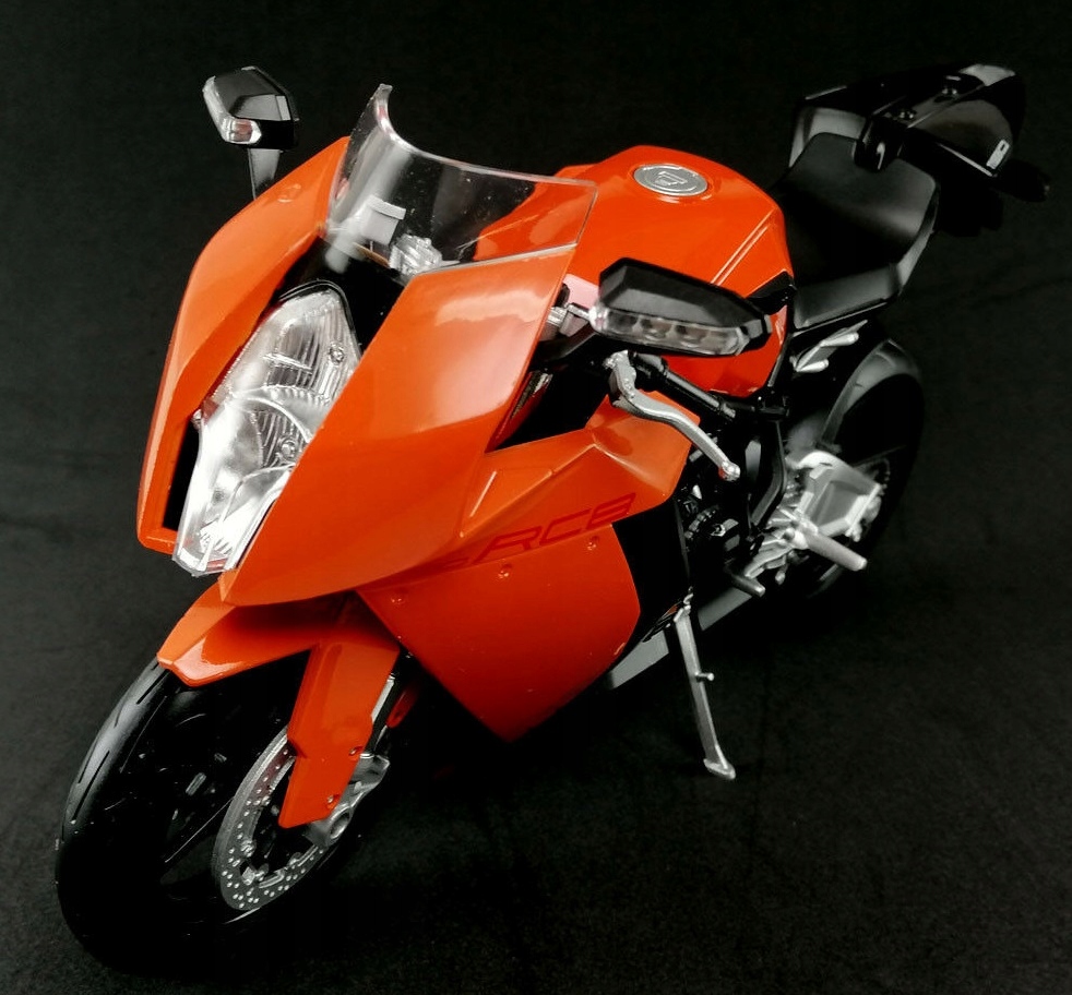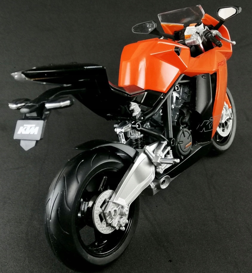 Модель мотоцикла KTM отличается вниманием к деталям. Имеет подвижные элементы: колеса, руль, задний поворотный рычаг, боковую подножку.