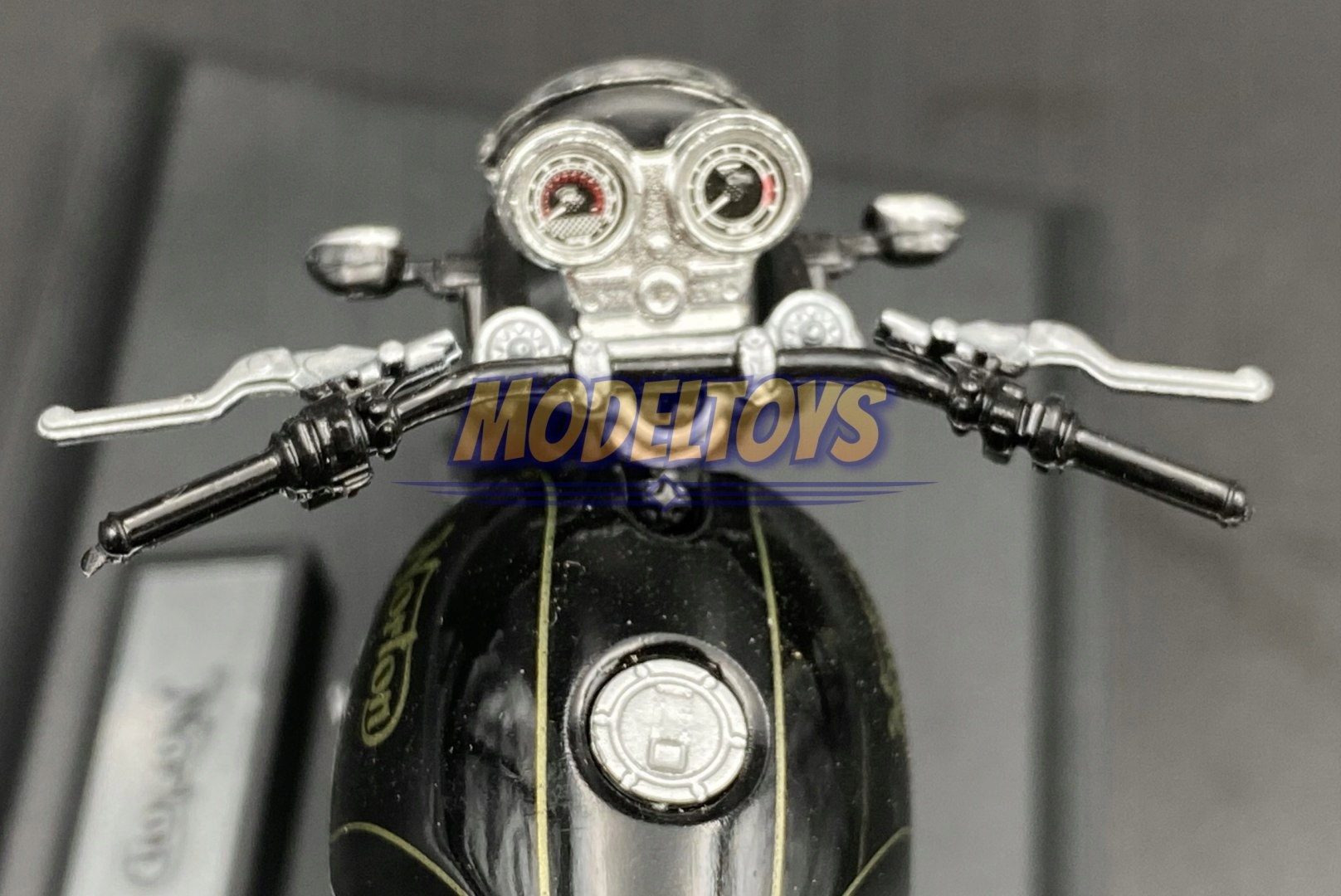 Модель в коробке с подставкой с названием мотоцикла.Мотоцикл откручивается от подставки - один винт.