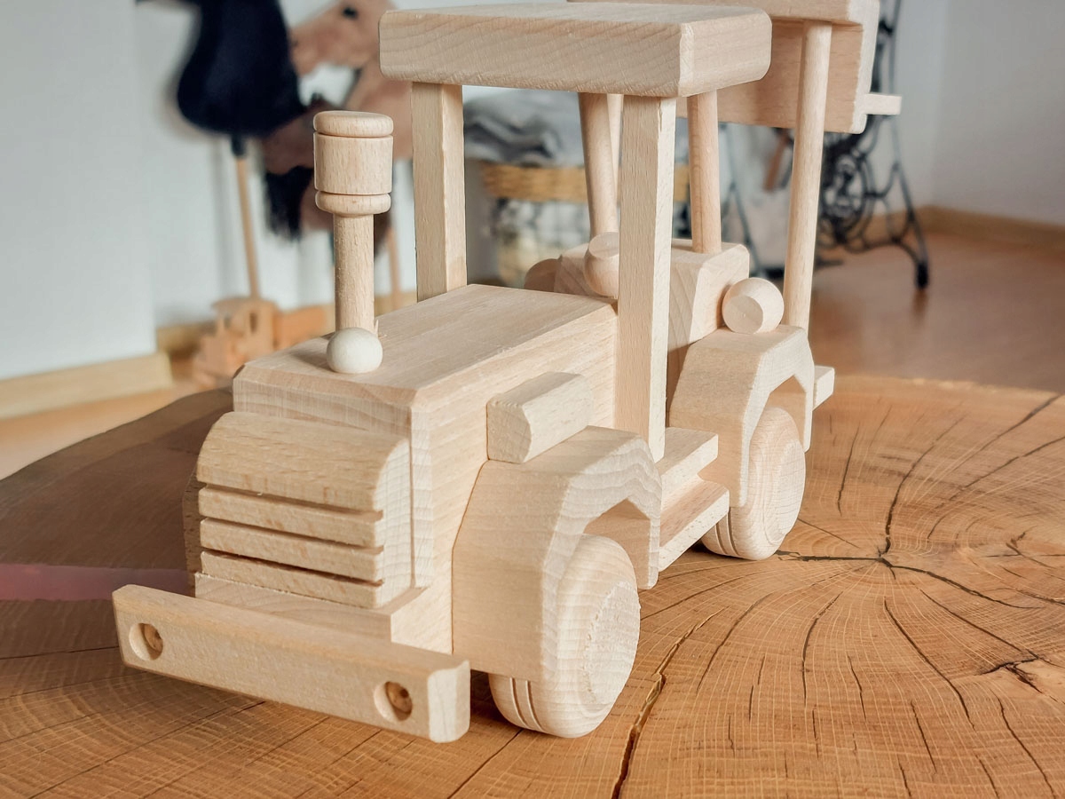Модель ручной работы из массива дерева, стилизованная под вилочный погрузчик.