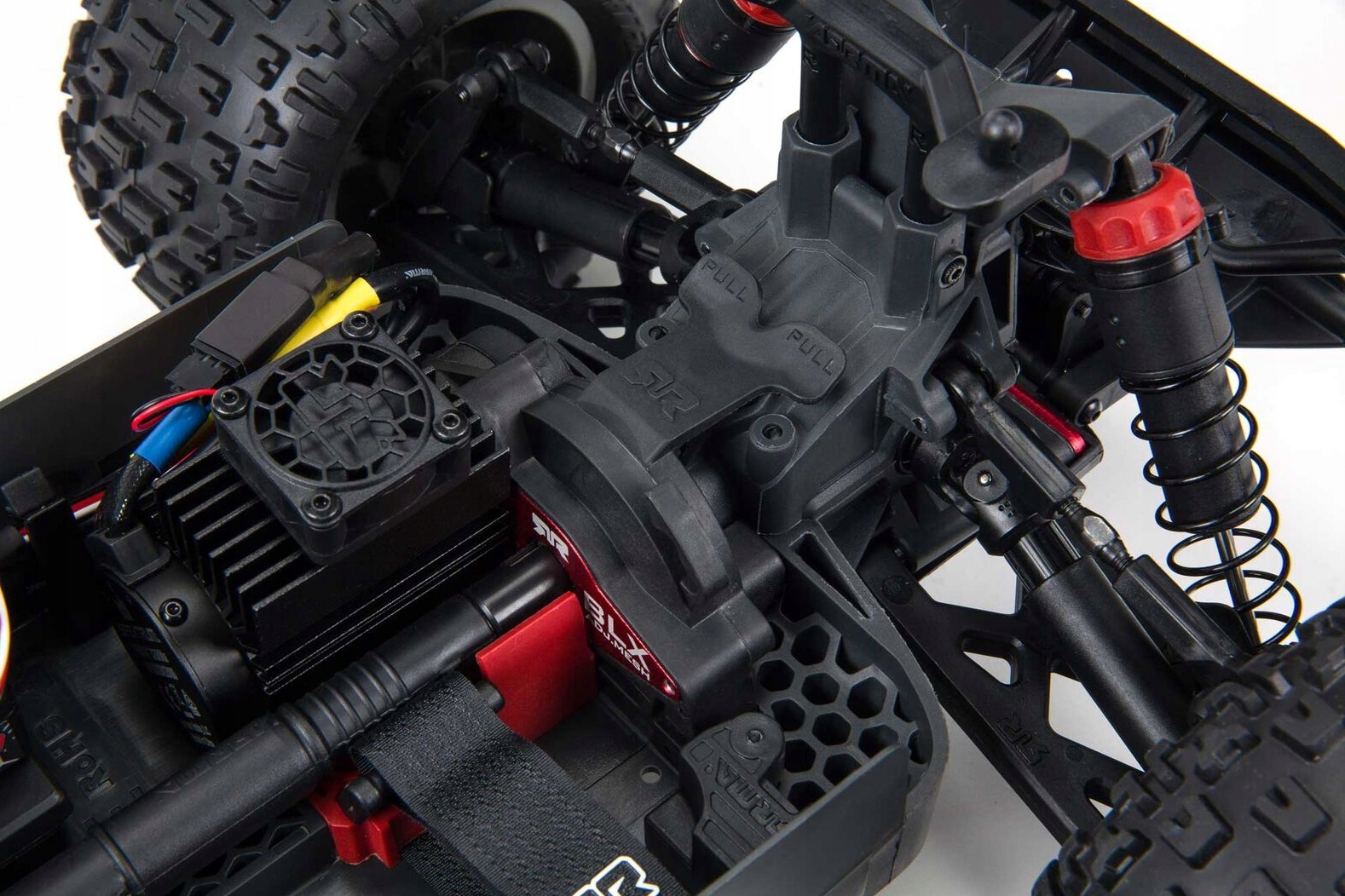 Запатентованные масляные амортизаторы поглощают все неровности на пути модели. Передние амортизаторы оснащены чехлами для защиты от ударов. Изменить жесткость и зазор можно путем замены силиконового масла или проставок. Силиконовые уплотнительные кольца обеспечивают надежное удержание масла.