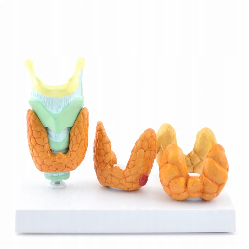 – на модели представлена здоровая щитовидная железа со следующими патологическими изменениями: папиллярный рак щитовидной железы, болезнь Хашимото, Базедова болезнь,