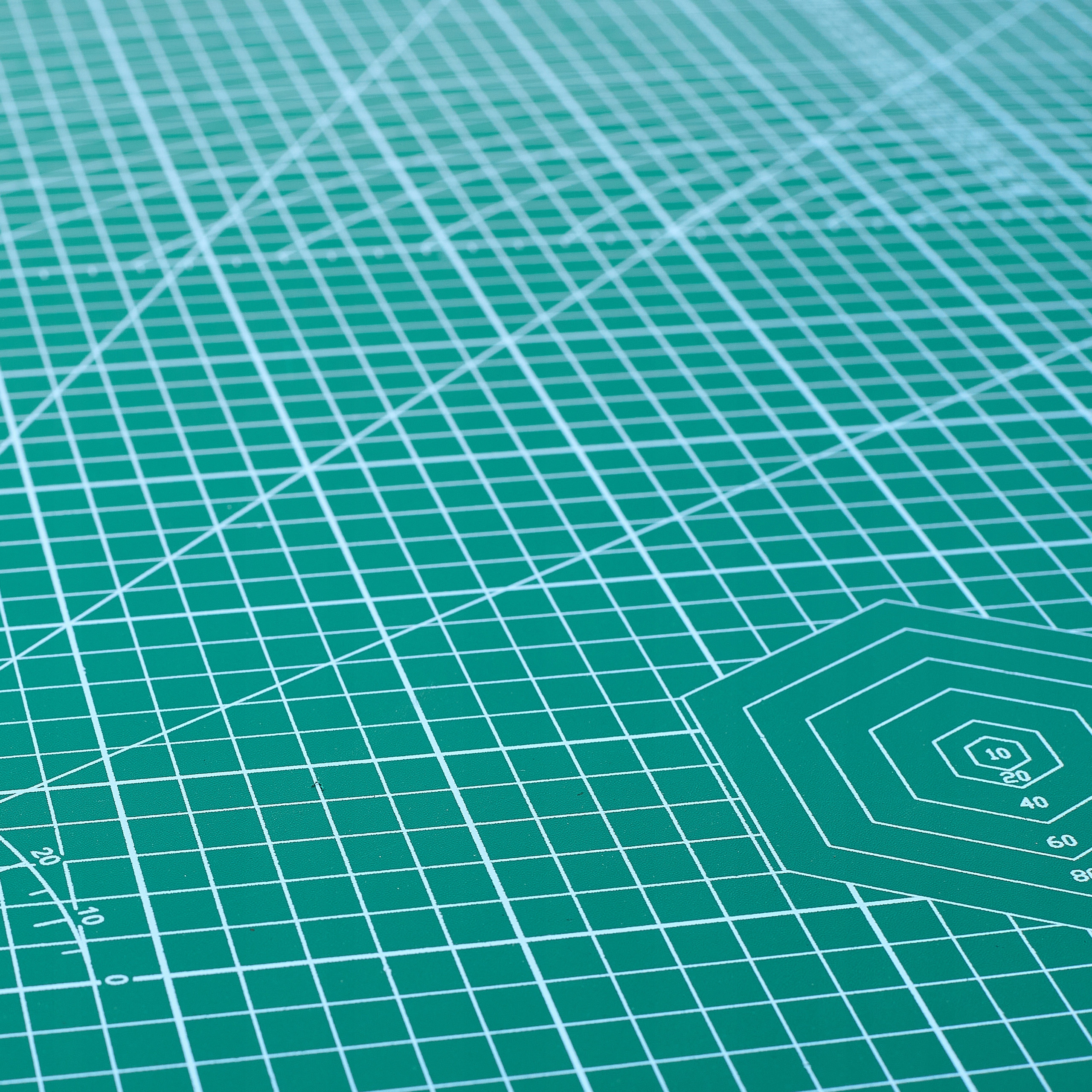 Коврик изготовлен из специального материала, обладающего самовосстанавливающимися свойствами – он частично регенерирует после разрезания лезвием. После резки коврик остается гладким. Коврик двусторонний - на нем напечатана шкала, вспомогательные линии и фигуры, полезные в работе, каждая сторона имеет свой принт. Коврик идеально подходит в качестве подкладки под рабочий стол или письменный стол, его можно использовать во время моделирования или работы в офисе. Коврик можно разрезать скальпелем, дисковым ножом или сегментным ножом.
