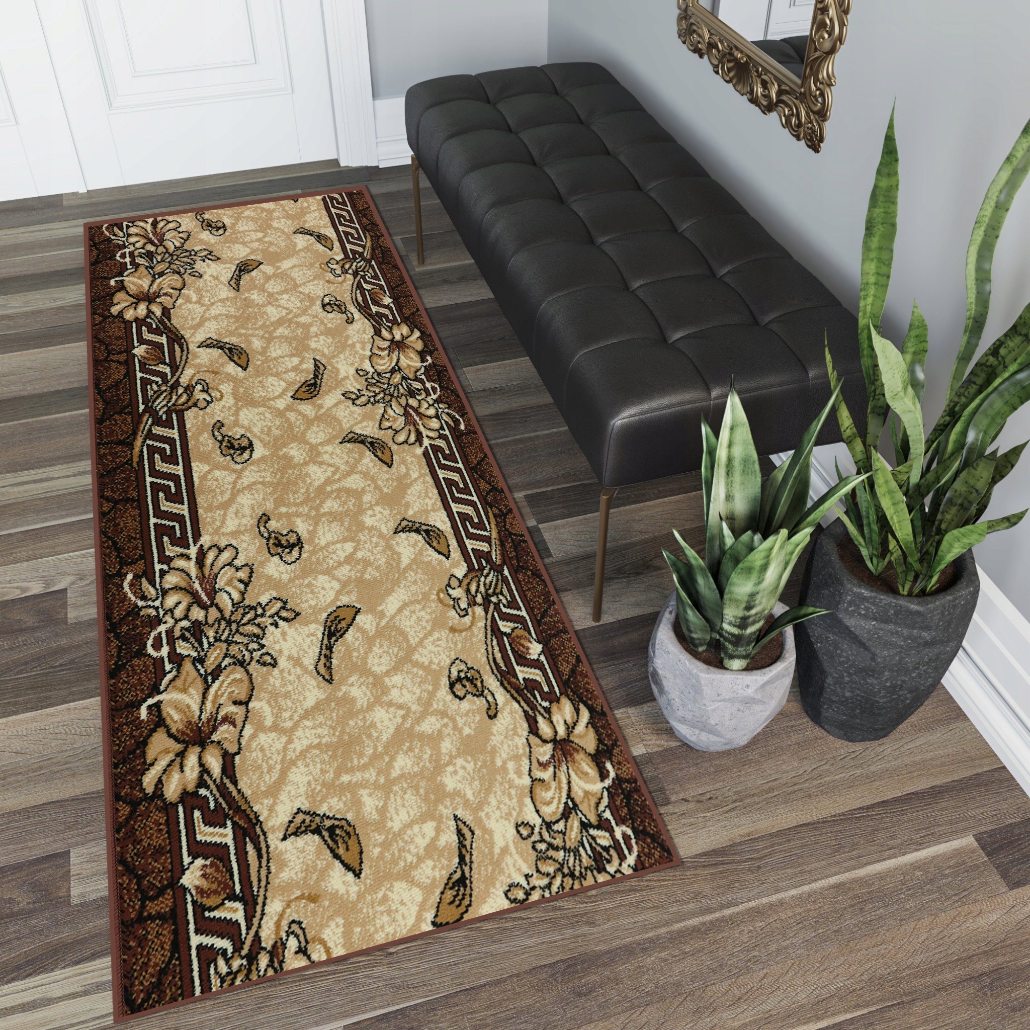 Нейтральные цвета ковров нарушены нотками экстравагантность за счет сочетания различных узоров, форм и элементов.