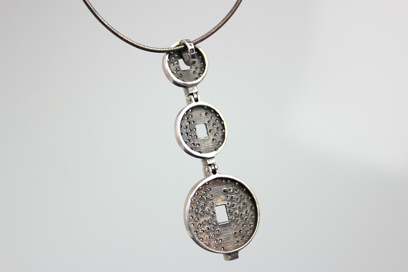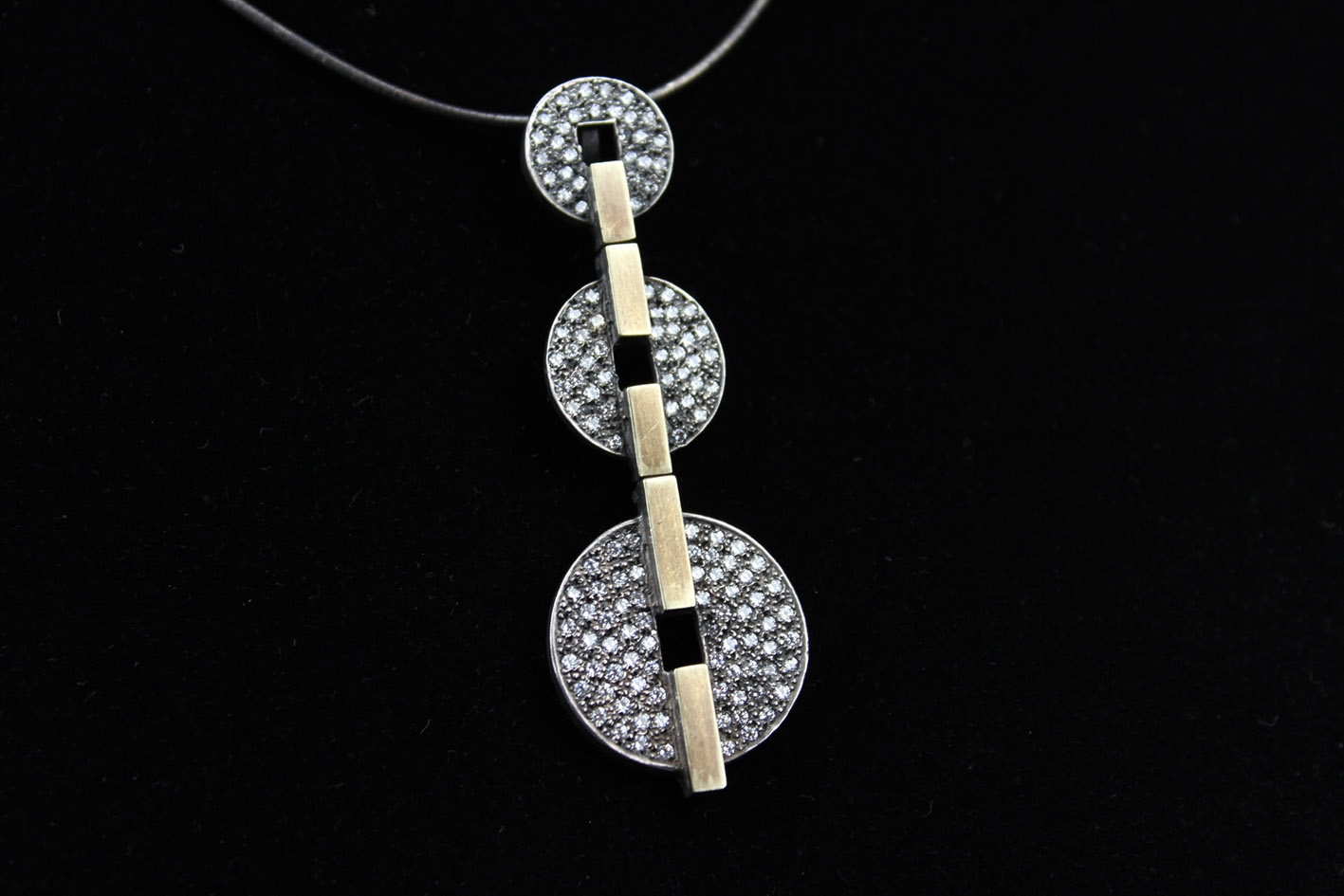 Элегантный кулон в стиле модерн из серебра, украшенный геометрической композицией из мелких сверкающих кристаллов и контрастных элементов из золота 375 пробы (9 карат). Композиция состоит из трех круглых сегментов, соединенных шарнирами – все элементы подвижны в одном направлении, благодаря чему кулон мягко складывается и очень хорошо прилегает к телу при ношении.