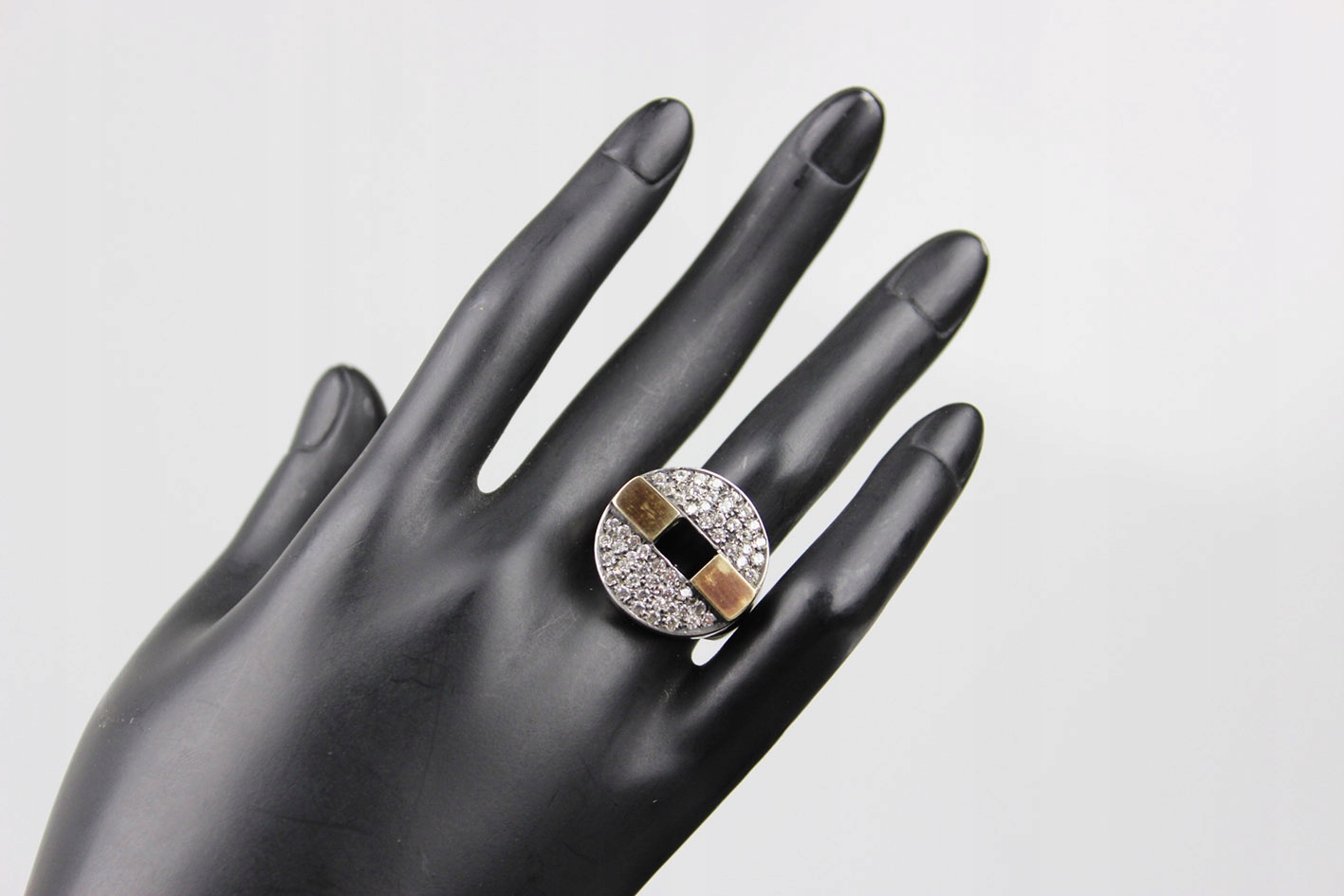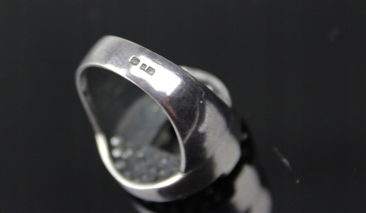 Привлекательное кольцо в стиле модерн, выполненное из серебра, украшенное геометрической композицией из мелких кристаллов и контрастными элементами из золота 375 пробы (9 карат). Массивная, выразительная форма и характерное сочетание материалов явно отсылают к дизайну 1990-х годов. Португальский продукт с явно дизайнерским характером.
