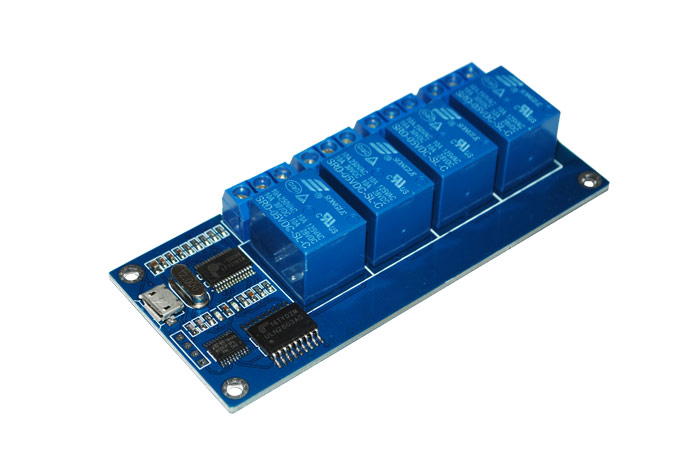 4-канальный релейный модуль небольших размеров, управляемый через USB-порт компьютера или другого устройства.
