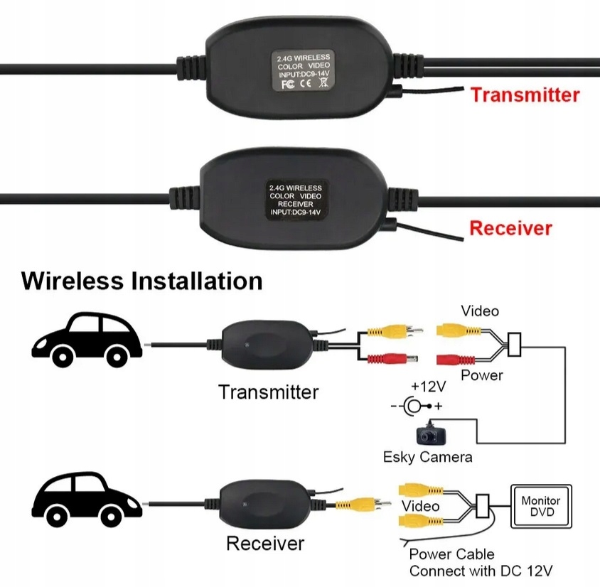 - Вилка передатчика: RCA RCA, вилка питания постоянного тока + кабель питания (плюс, минус)