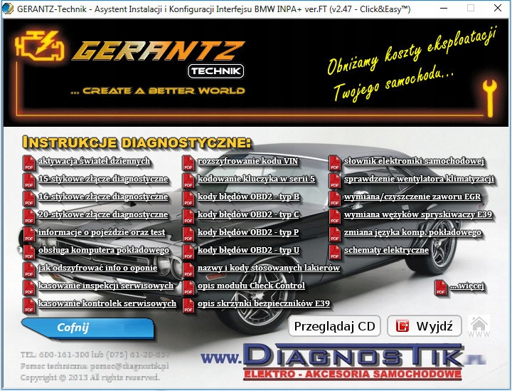 (инструкции, расположение диагностических разъемов на отдельных автомобилях, советы по диагностике, в том числе: удаление сервисных лампочек и лампочек проверки масла, коды ошибок.) и наша собственная программа: Помощник по установке и настройке устройств версия 2.47 с Click&Easy™