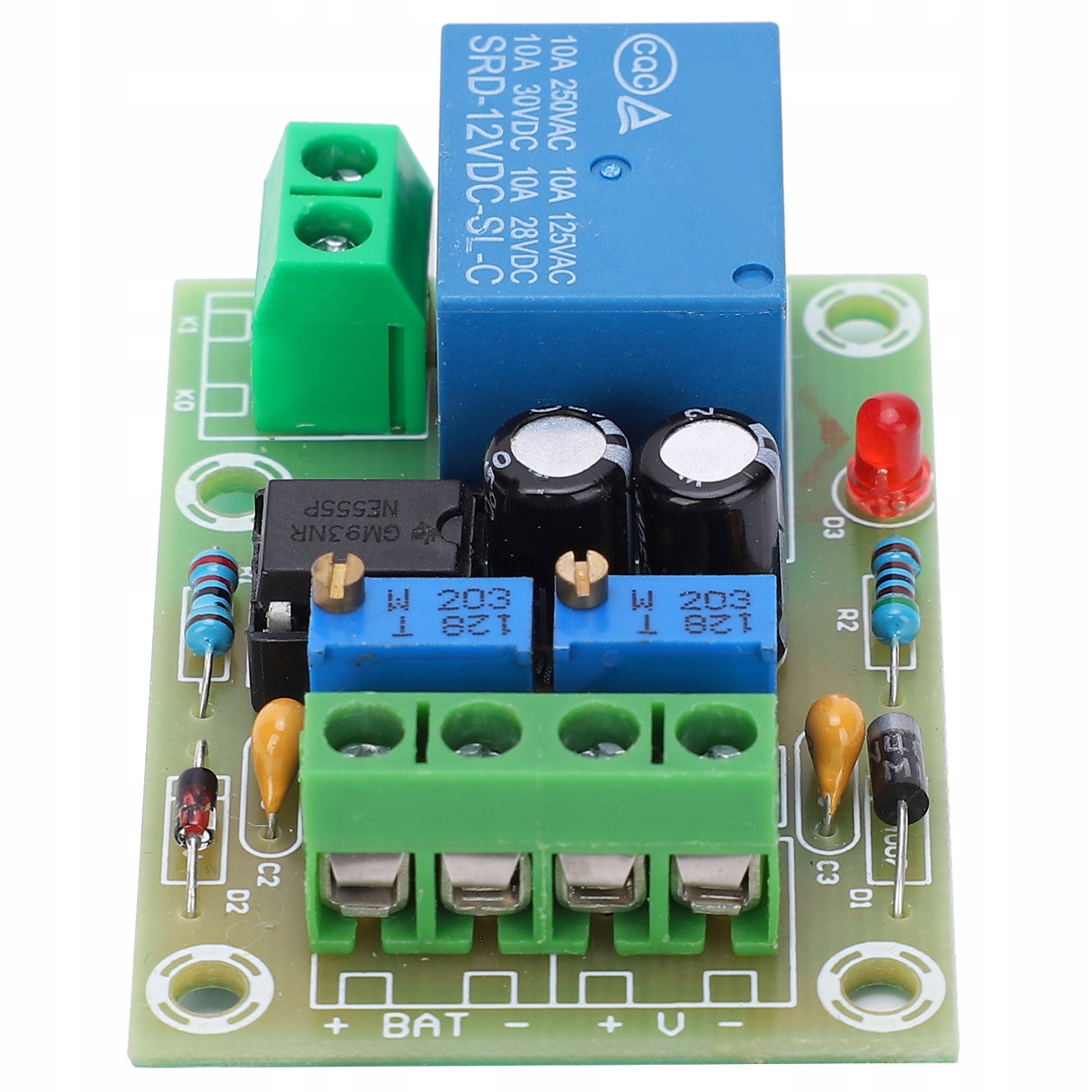 - VR2: Когда напряжение аккумулятора упадет до 10,5–11,5 В, зарядное устройство начнет зарядку, и реле разомкнется. (настройка пускового напряжения: уменьшение по часовой, увеличение против часовой стрелки.)