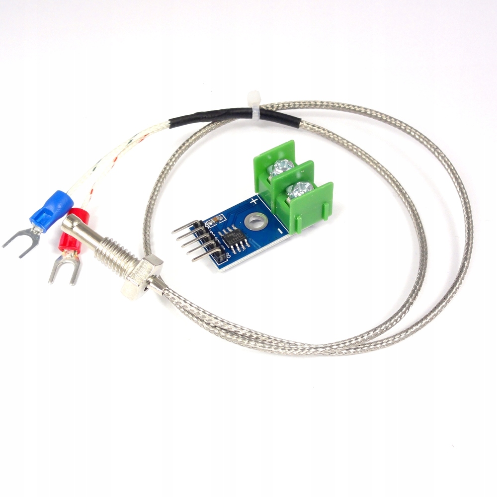 Модуль измерения температуры с аналого-цифровым преобразователем MAX6675 и датчиком типа К с резьбой М6. Зонд измеряет температуру в диапазоне от 0 до 800°C.