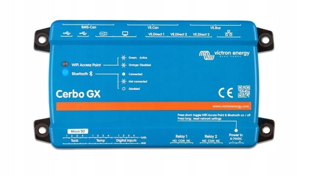 Cerbo GX MK2 теперь оптимизирован и более чем соответствует стандартам профессиональных установщиков. Новая функция Bluetooth обеспечивает быстрое подключение и настройку с помощью нашего приложения VictronConnect.