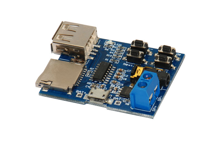 Полный модуль MP3-плеера, считывающий данные с карты micro SD - встроенного кардридера или с USB-разъема. Модуль имеет выход на динамик, встроенный усилитель мощностью 2 Вт, кнопки управления: смена песни, регулировка громкости, повтор, разъем для наушников/линейный вход. Питание через разъем micro USB или от внешнего источника 3,7-5В.