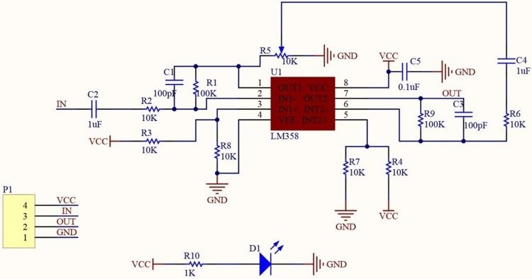 - Модуль операционного усилителя на базе микросхемы LM358. Обеспечивает впечатляющий прирост в 100 раз. На плате имеется светодиод, сигнализирующий о наличии питания.