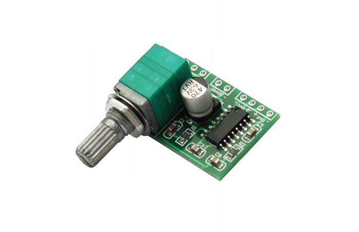 Модуль усилителя звука на базе микросхемы PAM8403. Модуль имеет входной разъем, два динамиковых выхода, разъем питания – крепежные отверстия. Регулировка громкости поворотным потенциометром - с переключателем.