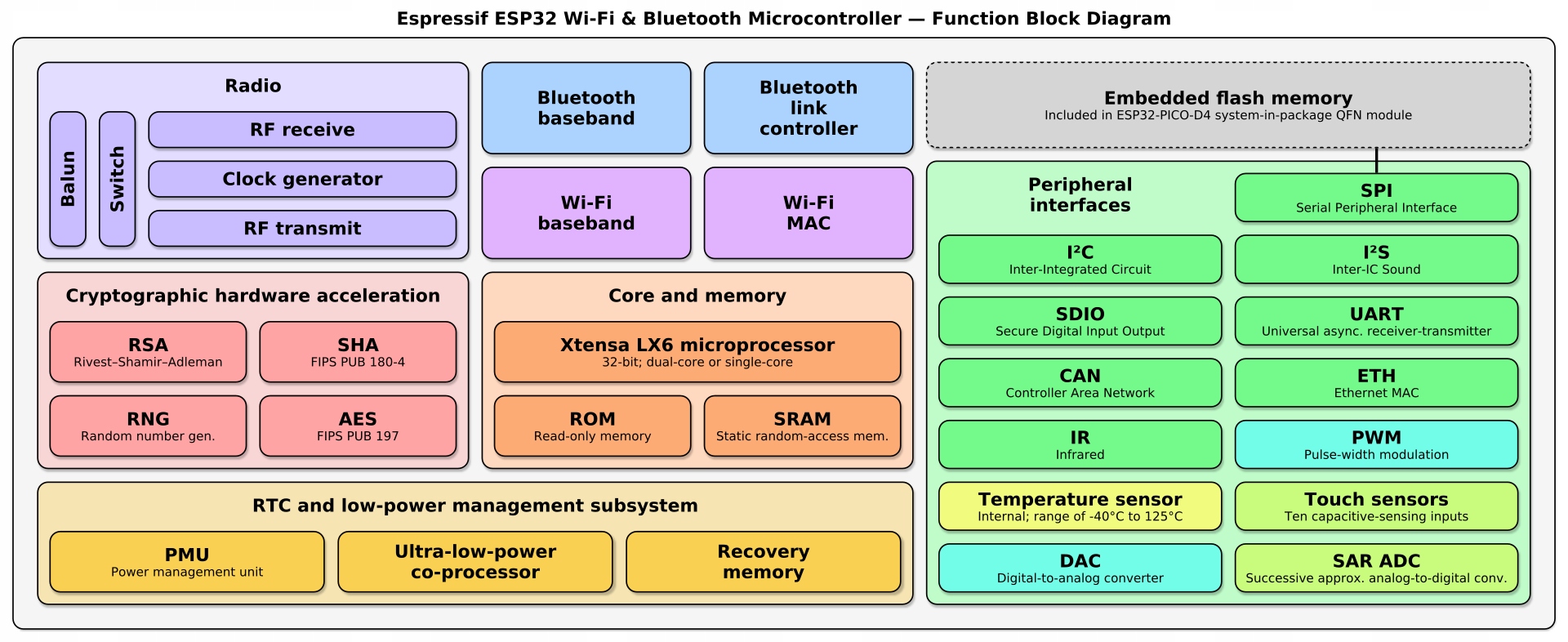 - ЦП: двухъядерный (или одноядерный) 32-разрядный микропроцессор Xtensa LX6, работающий на частоте 160 или 240 МГц и обеспечивающий скорость до 600 DMIPS.