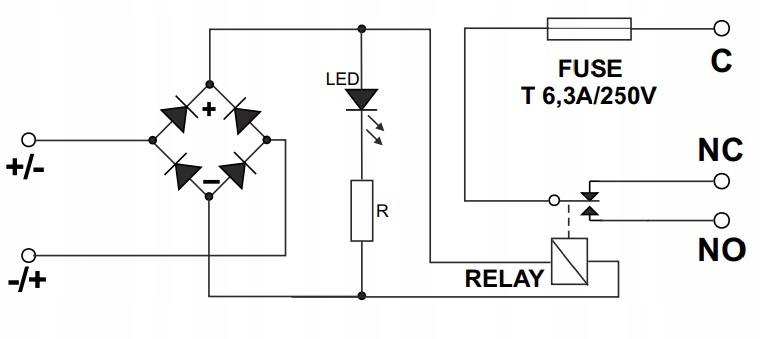 - Контакты реле: C/NC/NO (контакты Ø 2,05 мм: AWG 24–12)