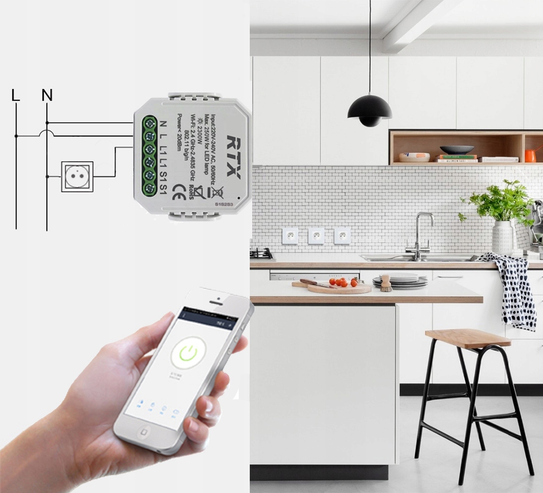 Релейный модуль устанавливается в коробку под традиционную розетку. После установки вы сможете управлять любым устройством, подключенным к розетке.
