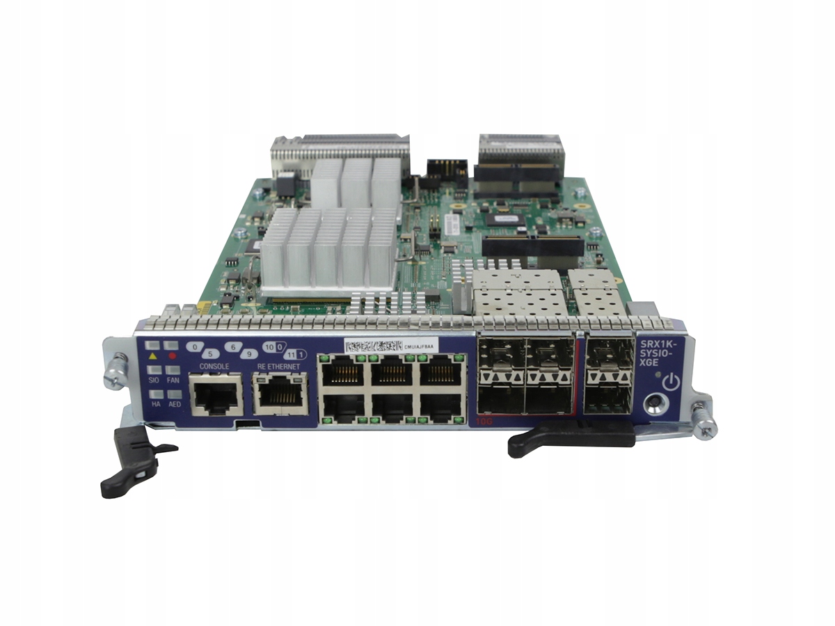 SRX1K‑SYSIO‑XGE — это плата системы и ввода-вывода (SYSIO, IOC) с портами 10GbE, установленная в шасси SRX1400. Предоставляет сетевые интерфейсы для обработки трафика данных, взаимодействие между Routing Engine/NSPC и уровнями физических каналов (портами). Соединяет корпус SRX1400 с портами RJ-45, SFP, SFP+. Он также включает (частично) функции кластеризации, порт управления и консольный порт.