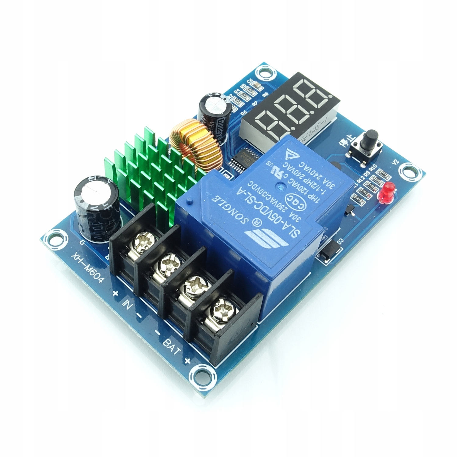 XH-M604 — модуль, контролирующий заряд аккумулятора в диапазоне от 6В до 60В. Он имеет дисплей, показывающий текущее напряжение аккумулятора, и 2 кнопки, позволяющие установить диапазон, при котором модуль должен начать зарядку.