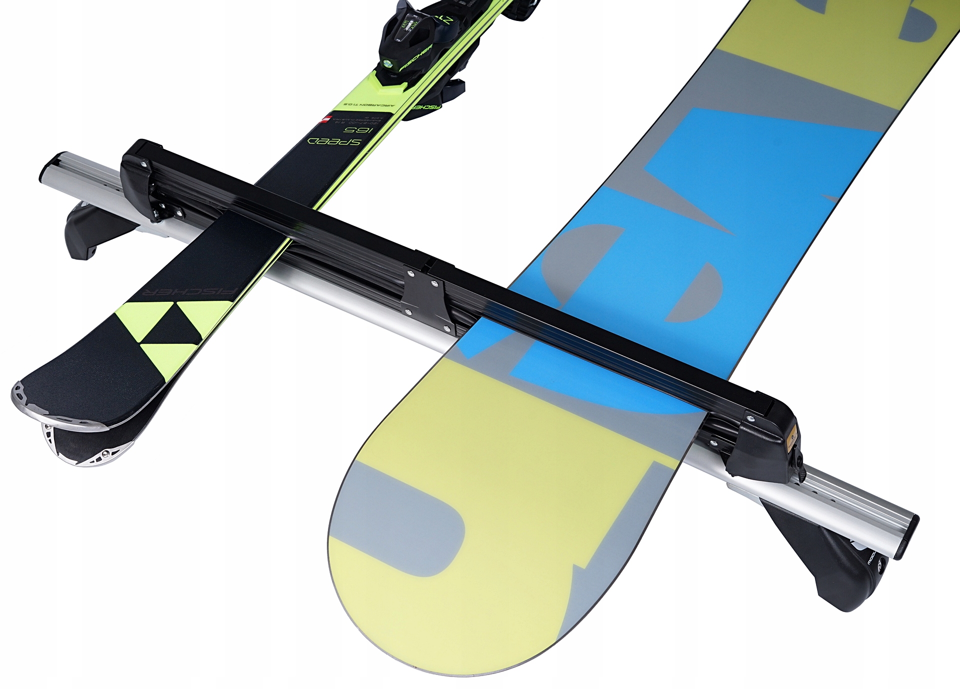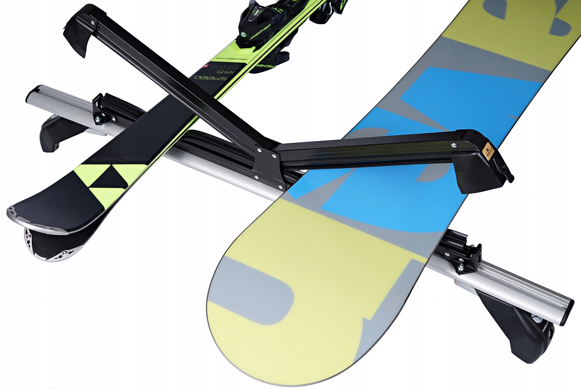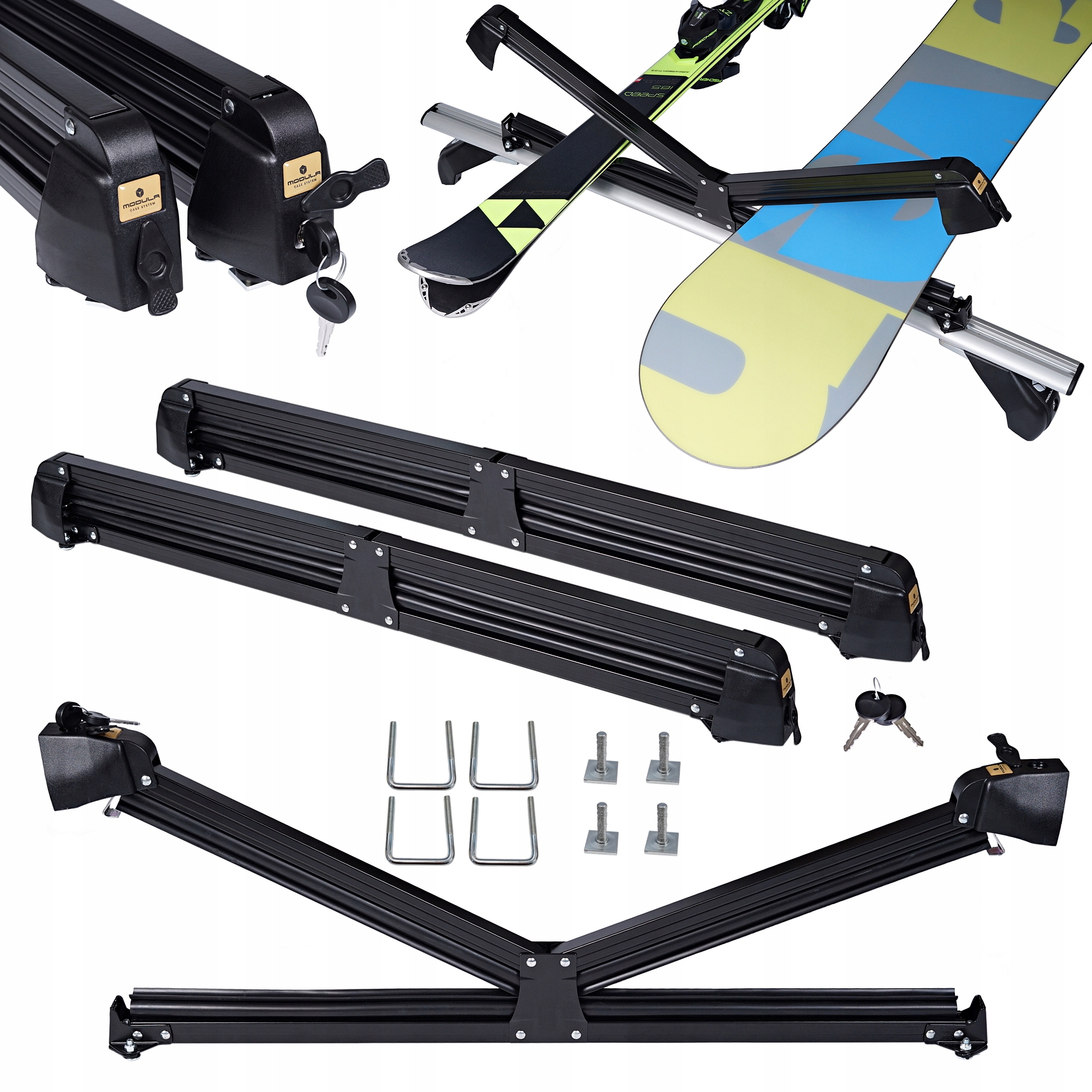 Алюминий, комплектный держатель для лыж от известного итальянского бренда Modula CS, позволяющий перевозить до 8 пар лыжили до 4 сноубордов.