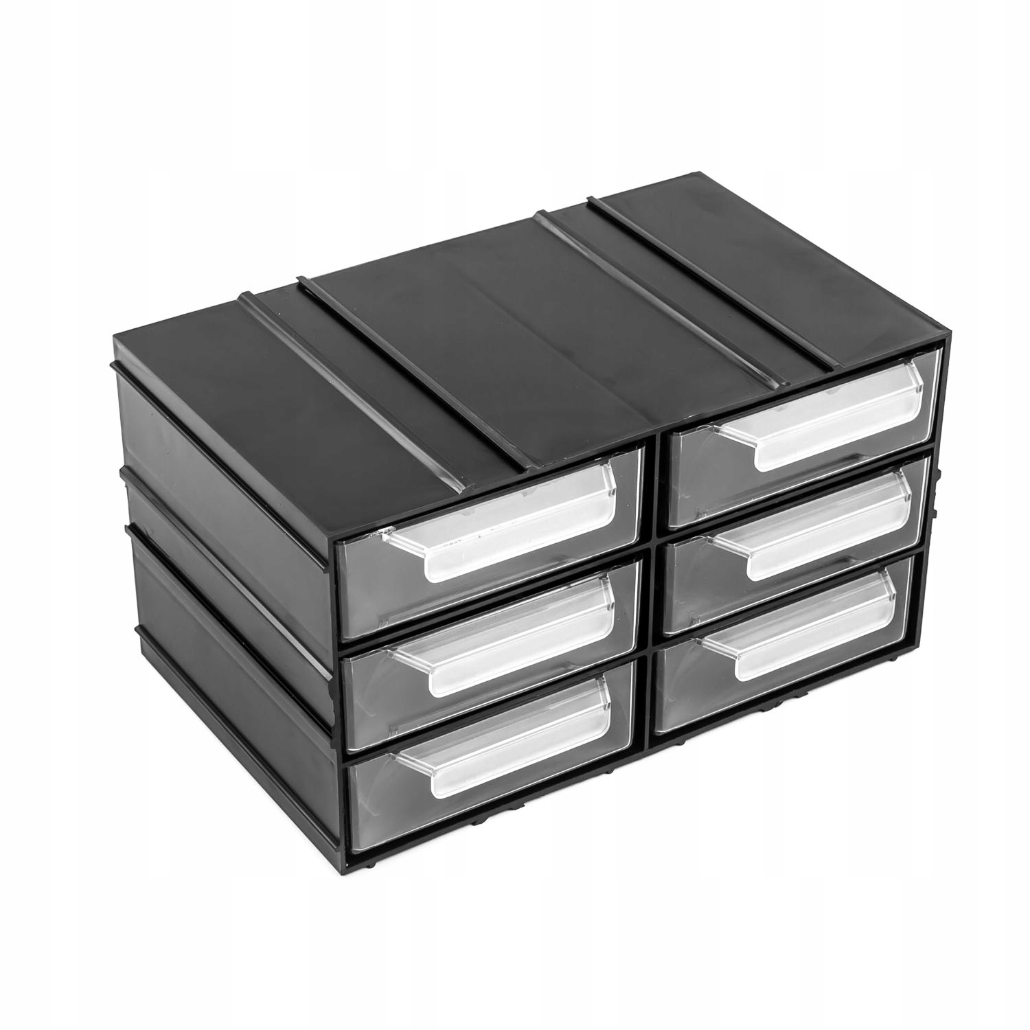 Шкаф состоит из шести прозрачных ящиков. Идеальное решение, когда вам нужно хранить мелкие предметы, например, электронные компоненты, винты, детали, гайки, шайбы, камни, полуфабрикаты, монеты, марки, крючки и другие мелкие предметы. Модули можно соединять друг с другом в большие комплекты с помощью специальных выступов. Модули можно повесить на стену или поставить на стол. Черный корпус (полипропилен), прозрачные ящики (полистирол).