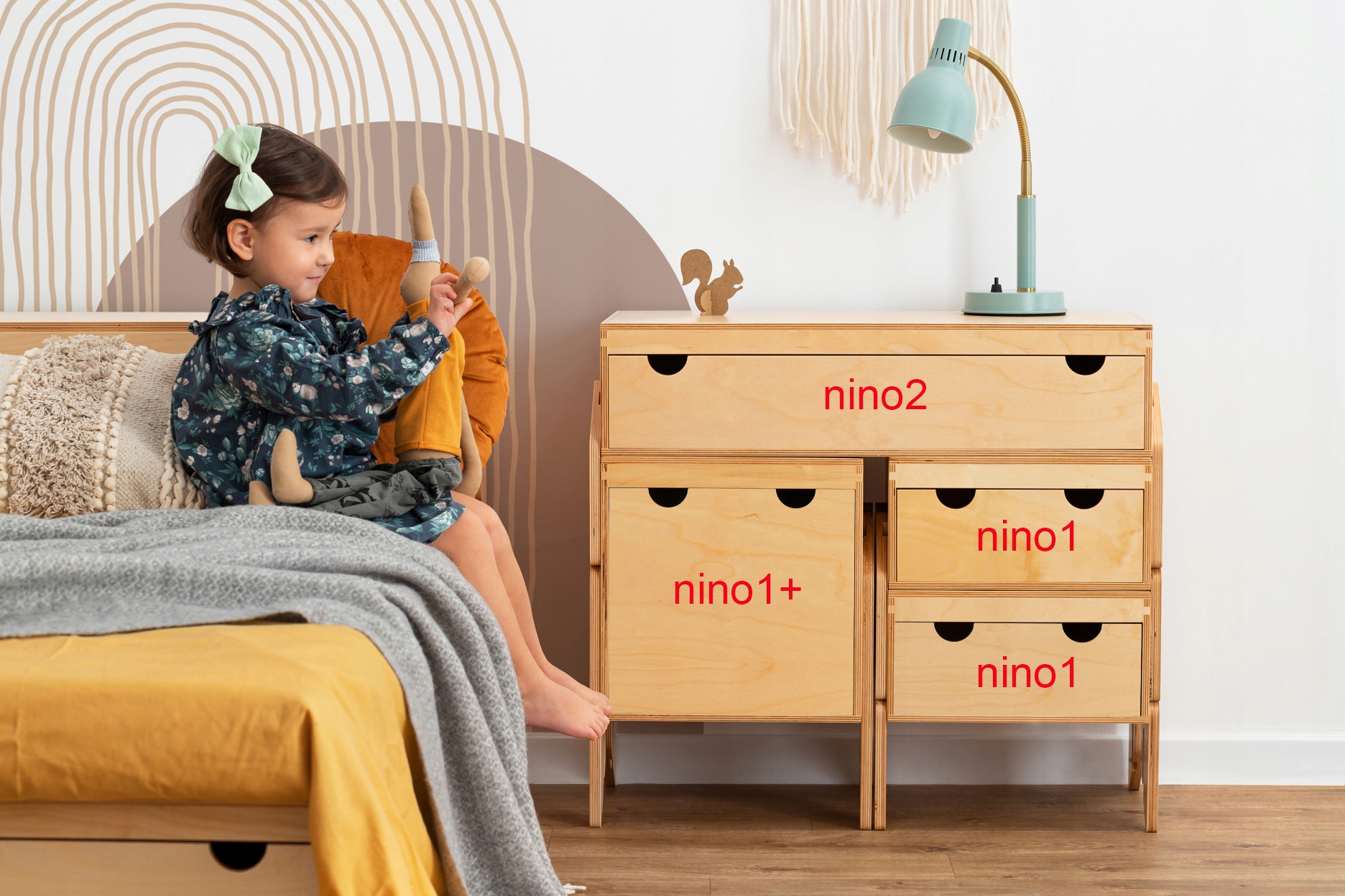 Небольшой деревянный шкаф «Нино» — чрезвычайно функциональный и современный модульный предмет мебели, который идеально подойдет для любой детской комнаты. Благодаря продуманной конструкции он может играть множество ролей - от классической тумбочки, через столик, до дополнительного сиденья для ребенка.