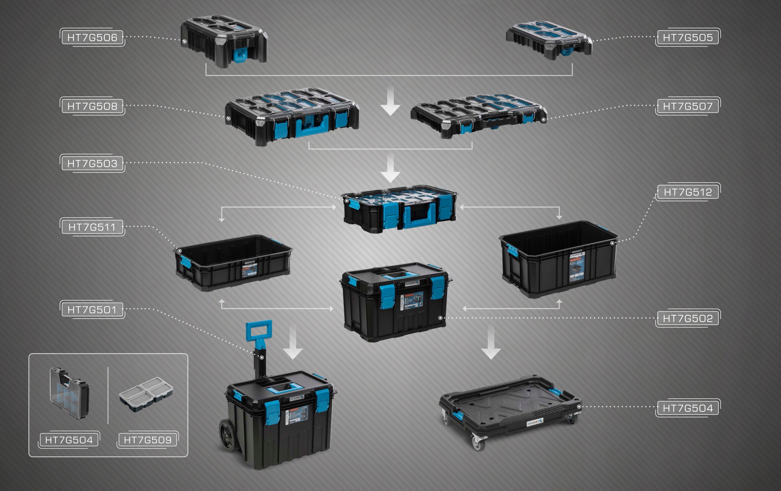 Коробка 4-в-1 — прочное и удобное решение для каждого требовательного пользователя. В комплект входят следующие коробки: HT7G501, HT7G502 и HT7G503. Коробка изготовлена из высококачественных материалов, устойчивых ко всем видам повреждений. Коробка обеспечивает повышенную пылезащиту и устойчивость к воде. Усиленная конструкция стенок и прочные крепления из АБС-пластика повышают долговечность и устойчивость к повреждениям. Кроме того, внутри ящика имеется функциональный держатель и большие обрезиненные колеса для удобства транспортировки. Ящик 4-в-1 – идеальное изделие для хранения и транспортировки различных предметов. Предназначен для профессионального использования. Он отлично работает во многих отраслях, таких как строительство, промышленность, автомобилестроение и логистика.