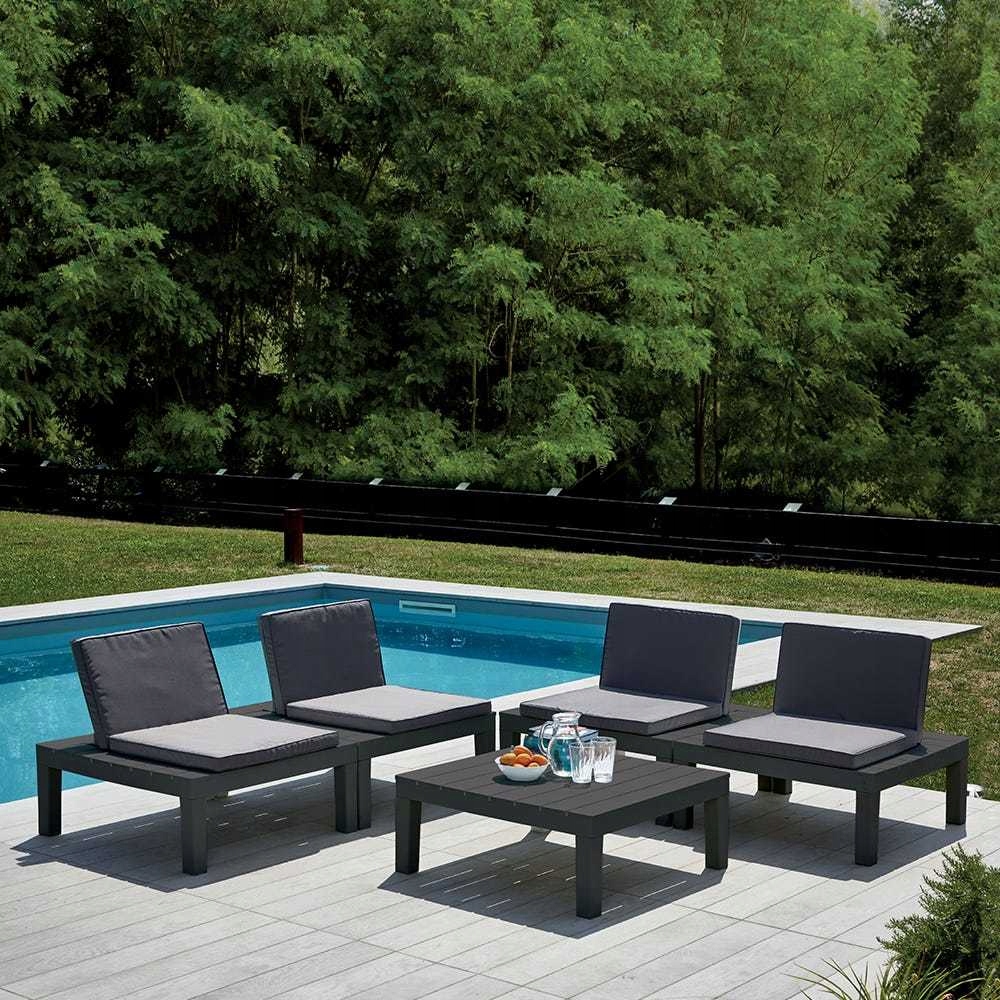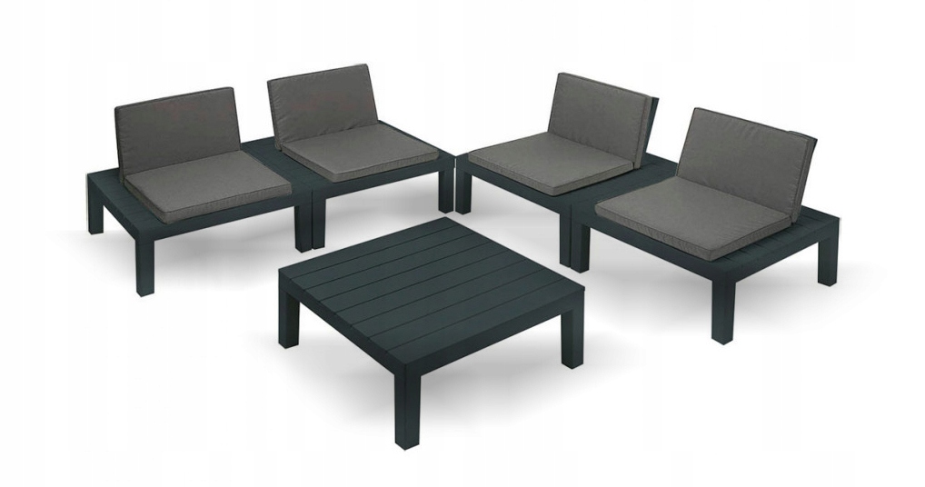 Богатый набор садовой мебели состоит из журнального столика и 4 модульных кресел антрацитового цвета.