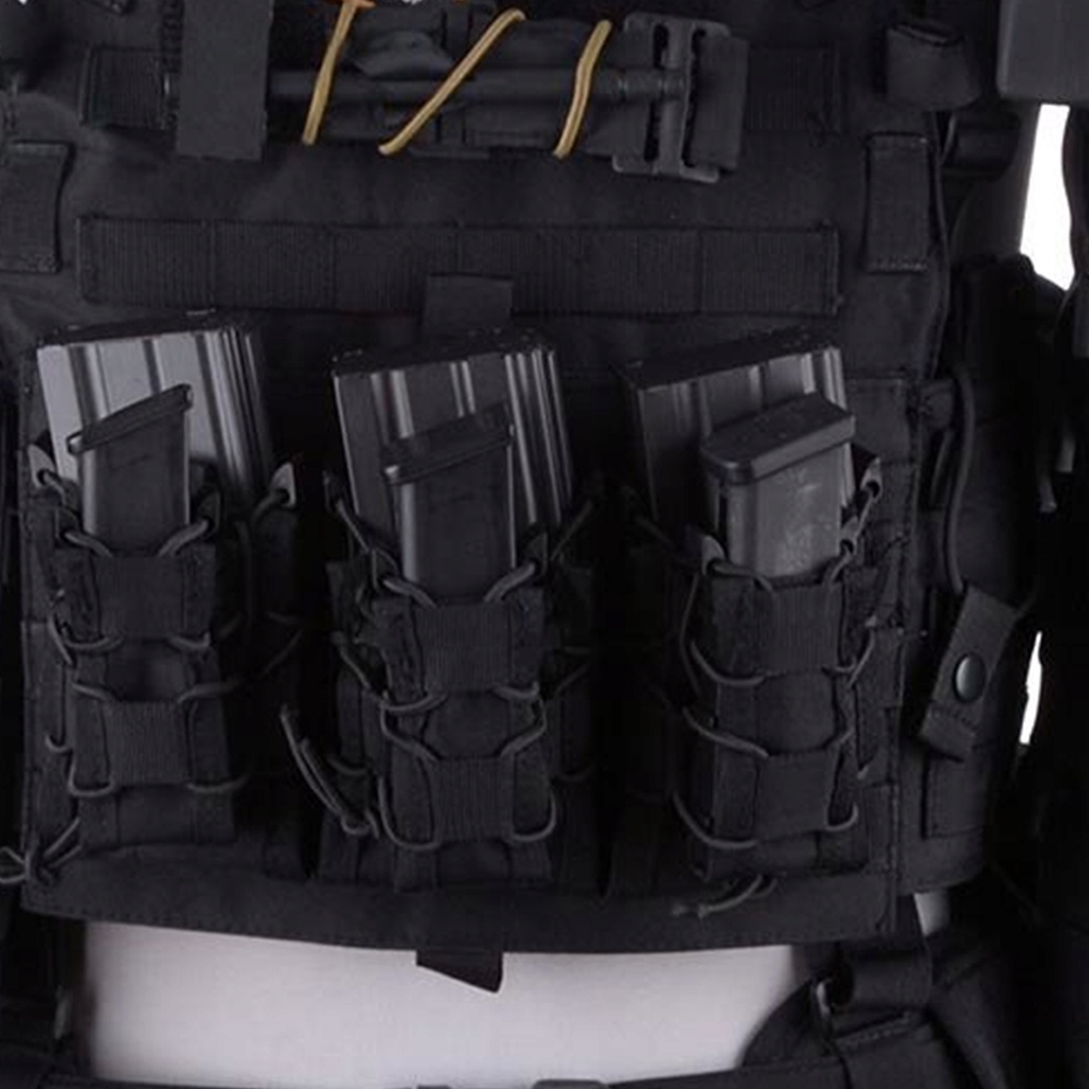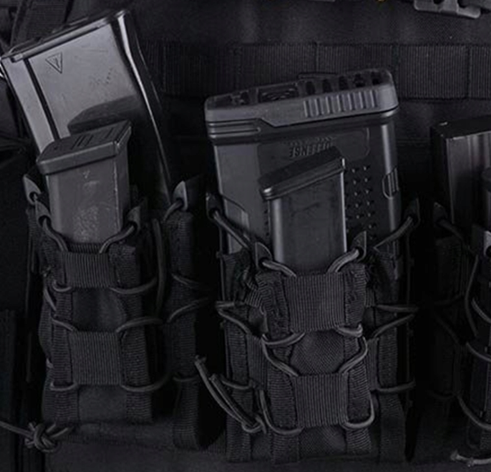 Сумка изготовлена из прочного нейлона. Боковые вставки из пластика защищают магазин от выпадения. Магазин удерживается в кармане благодаря эластичному шнуру, позволяющему быстро извлекать его при отсутствии клапана.