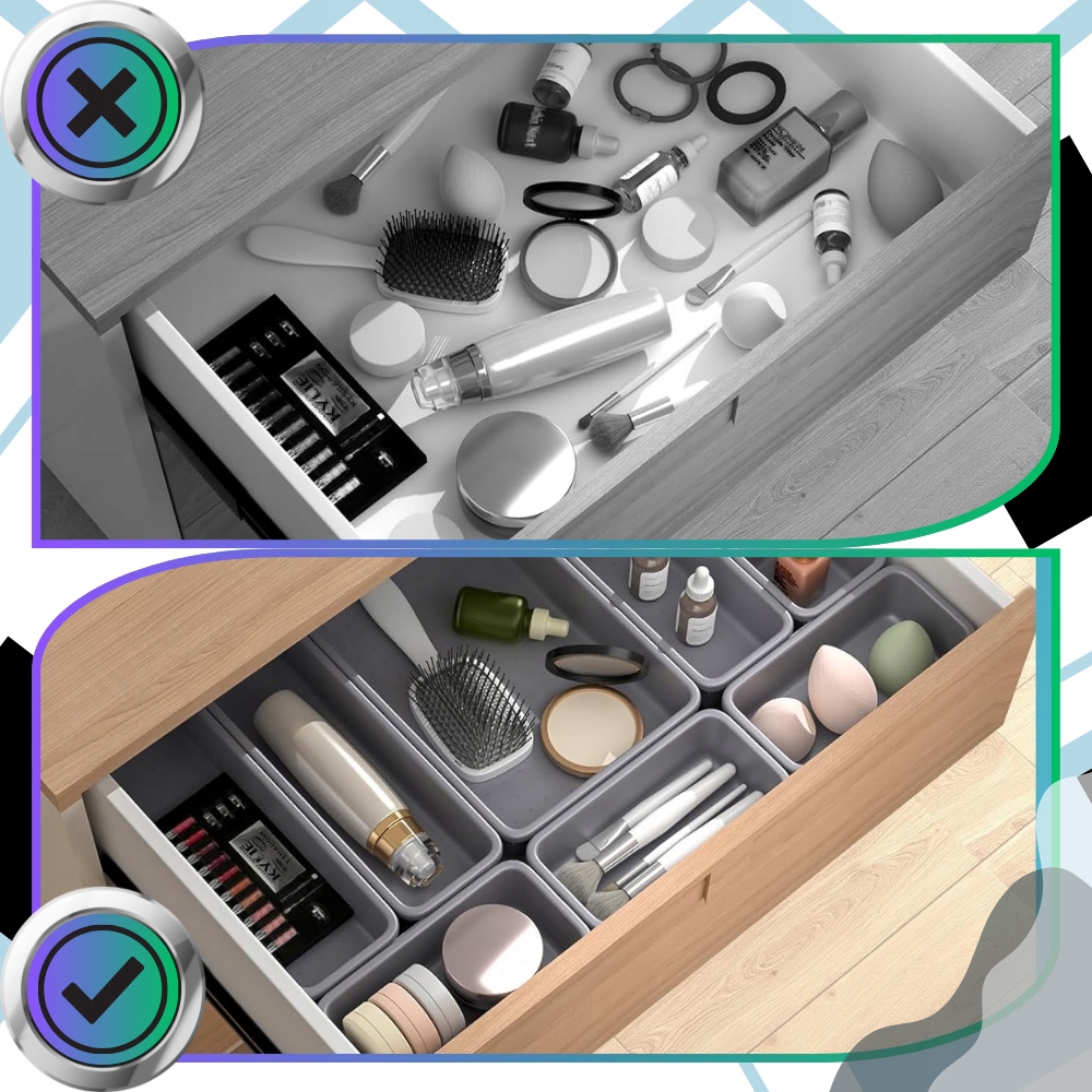 ✅ Гладкая поверхность контейнеров делает выдвижные контейнеры простыми в чистке и гигиеничными в повседневном использовании. Разнообразие размеров позволяет максимально эффективно использовать имеющееся пространство и адаптировать планировку под размеры конкретного ящика. Модульный органайзер — идеальное решение для людей, которые ценят функциональность, порядок и эстетику.