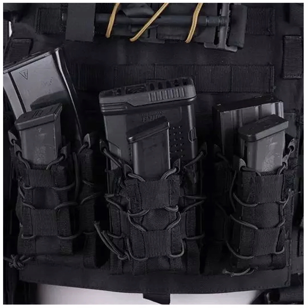 Прикрепляется к снаряжению благодаря системе MOLLE. Подсумок не имеет классического клапана, что позволяет быстро извлечь магазин.