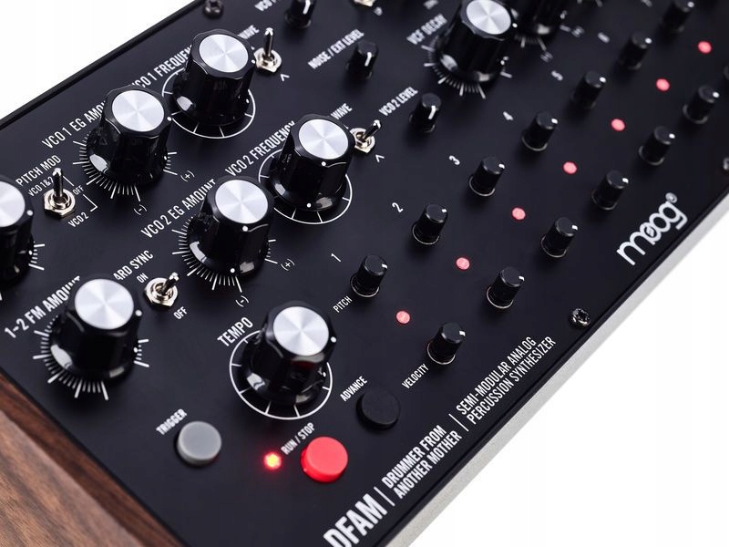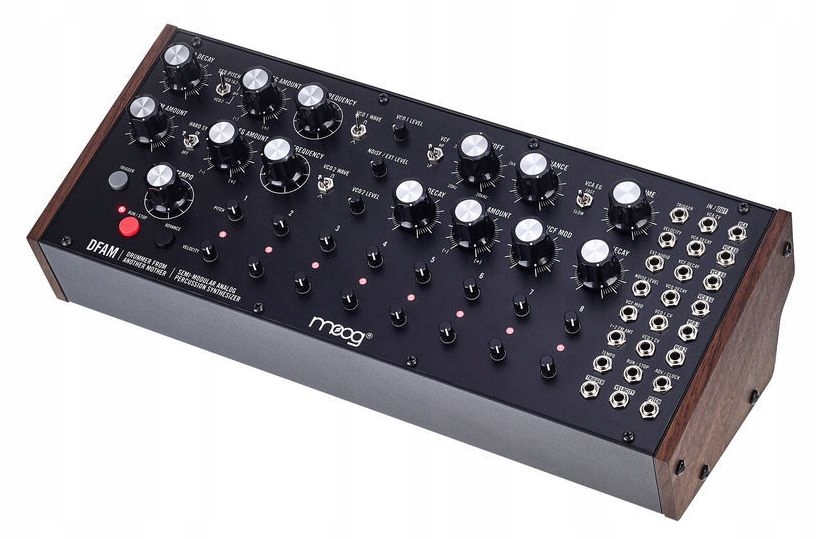 Moog DFAM (Drummer From Another Mother) – полумодульный синтезатор ударных. Это полностью аналоговое устройство, оснащенное 8-ступенчатым секвенсором и тремя огибающими (шаг, фильтр и VCA). Включает в себя генератор белого шума, пару генераторов прямоугольных и треугольных волн, а также лестничный фильтр с переключаемыми режимами низких и высоких частот.