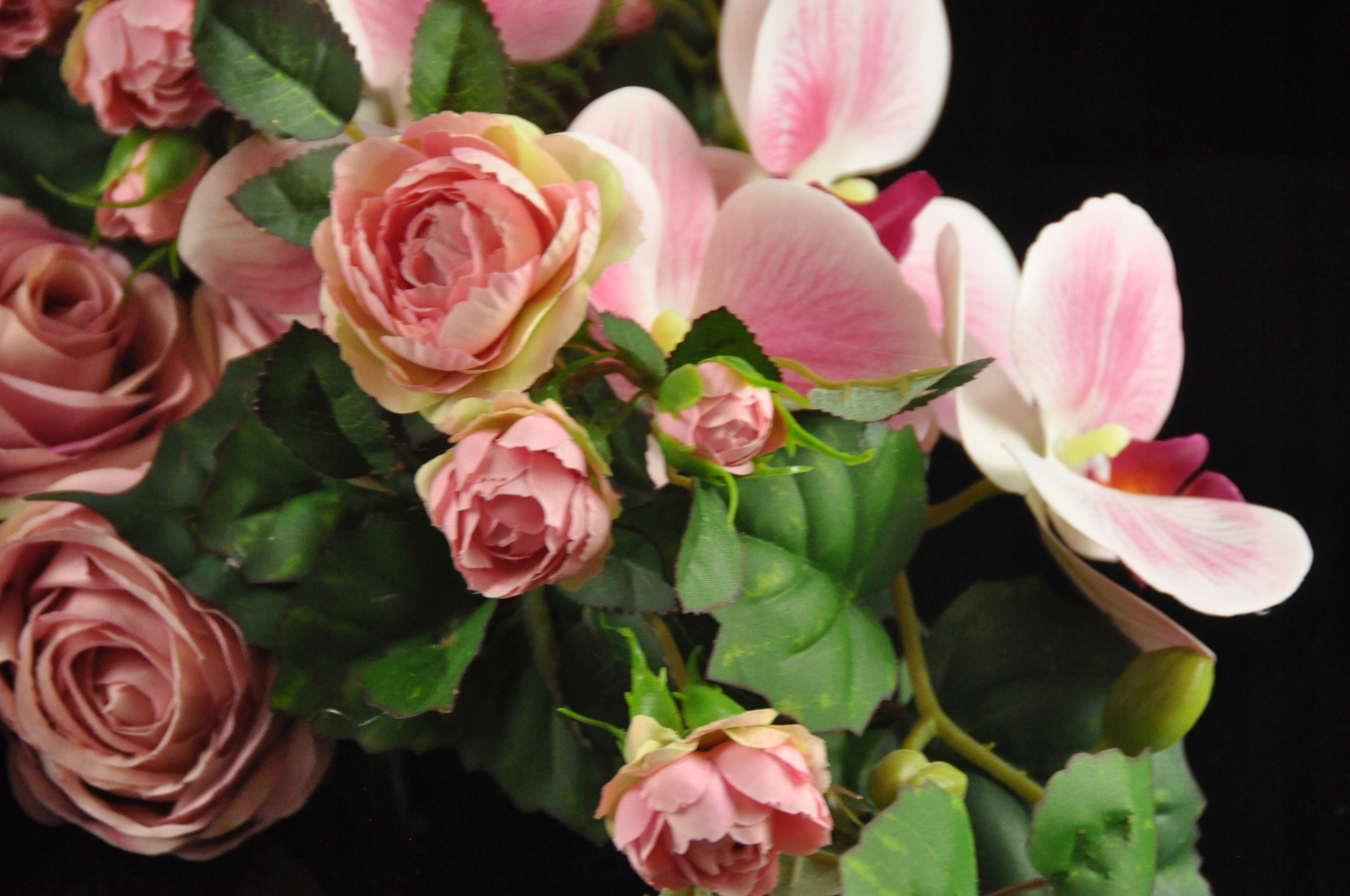 Выполнены из цветов: розы, орхидеи, веточки, листья, аксессуары.