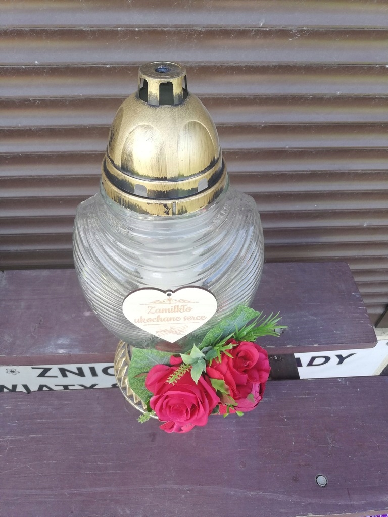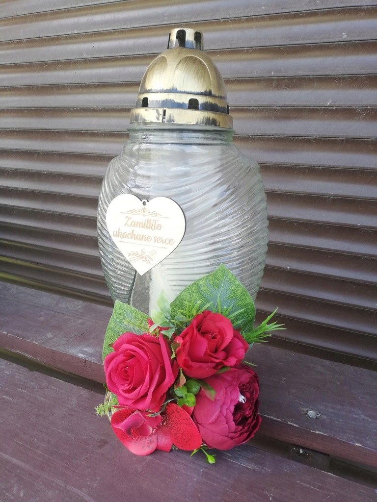 Цветочная композиция на могилу была тщательно изготовлена, с использованием модных цветов, материалов очень хорошего качества и искусственных цветов. Стеклянная свеча, представленная на фото, украшена цветами.