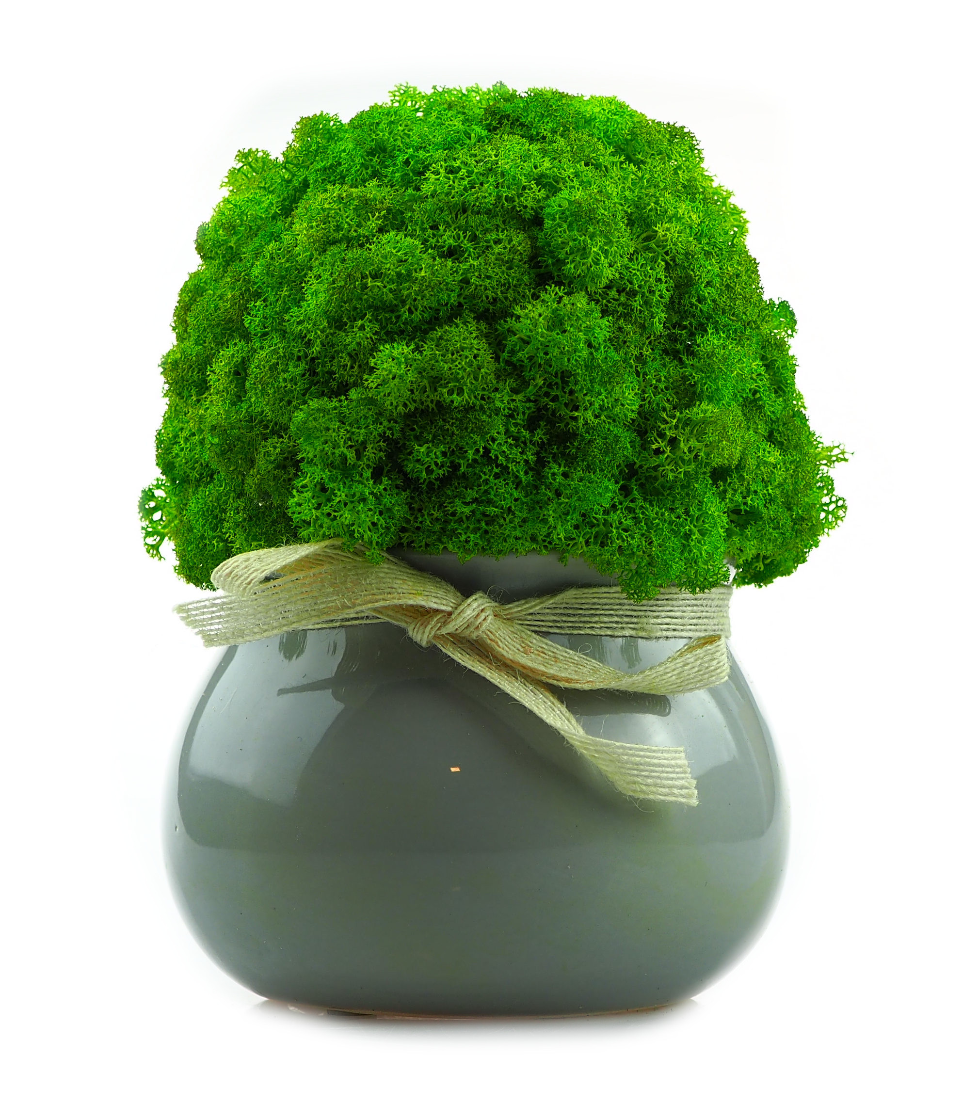 Красивый круглый цветочный горшок с мхом хроботек. Перевязана кремовой лентой.