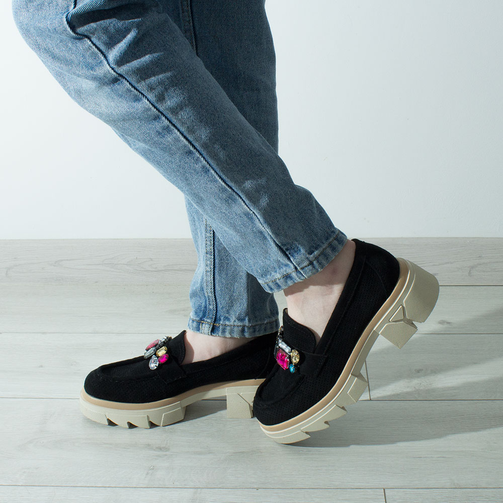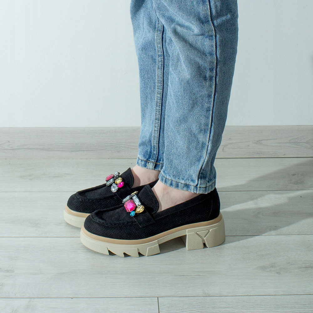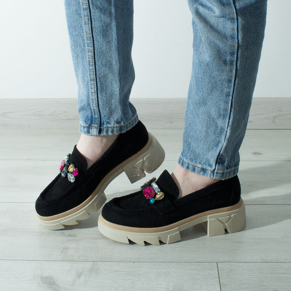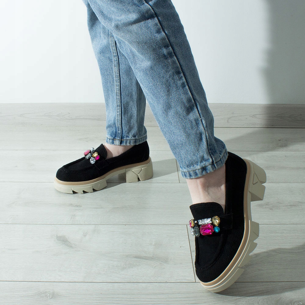 Они идеально сочетаются с любым нарядом. Они являются модным элементом в любом стиле. Мокасины украшены красивыми разноцветными камнями. Туфли из эко-замши. Внутри мягкая кожаная вставка повышает комфорт при ношении. Туфли имеют устойчивую платформу контрастного цвета.