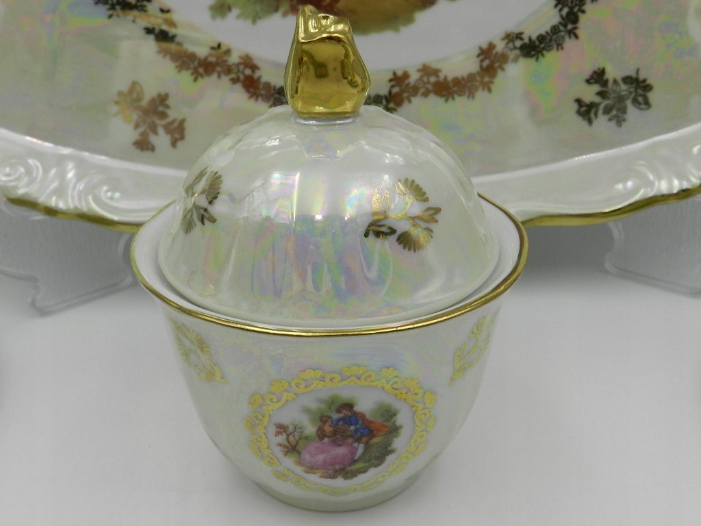 Комплект выглядит исключительно красиво, что, несомненно, связано с переливающимся декором - >структурный цвет радуги. Особого внимания заслуживает красивый фарфоровый поднос, на котором хранится весь сервиз, который, несомненно, имеет большое эстетическое и функциональное значение.