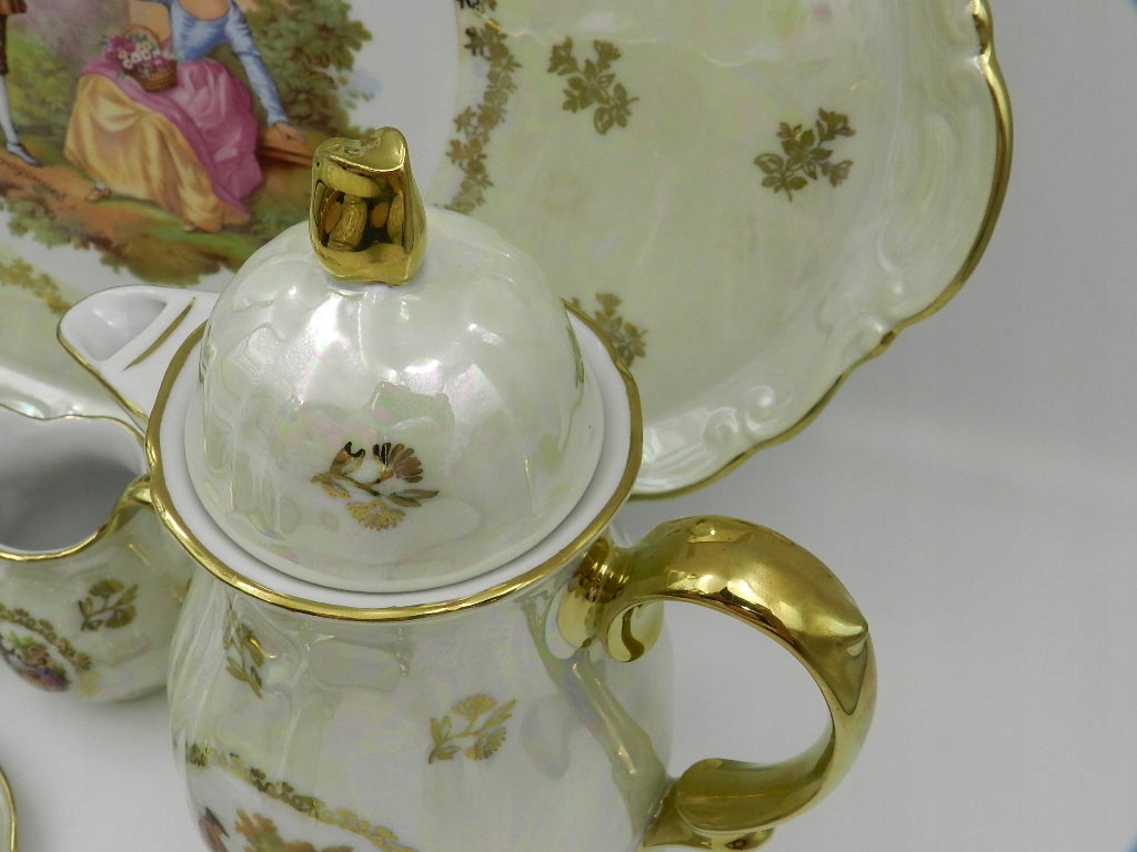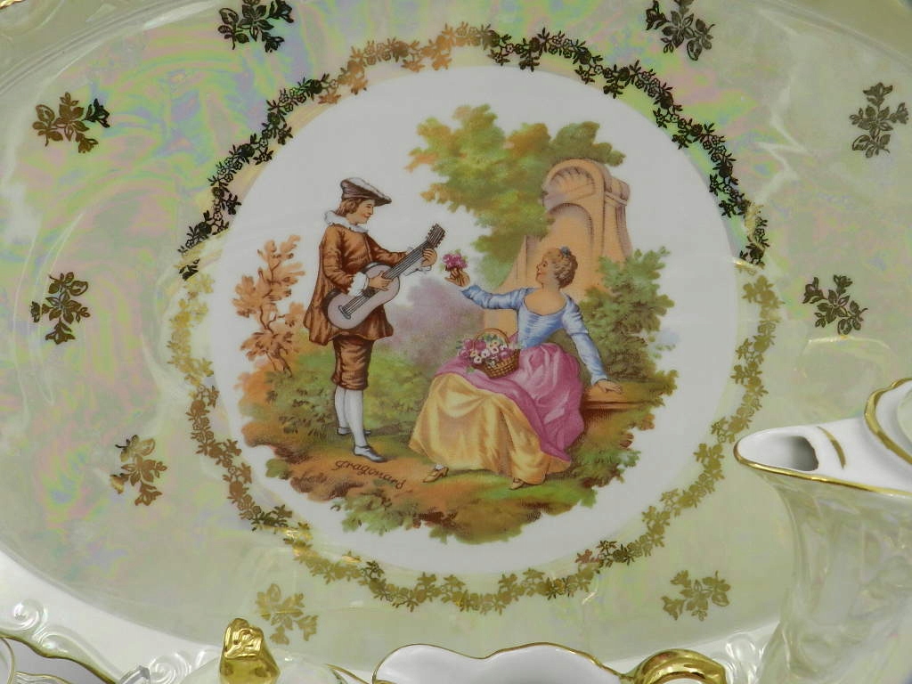 Высококачественный белоснежный фарфор нежной и утонченной формы, украшенный различными жанровыми сценками в виде любовных ухаживаний.
