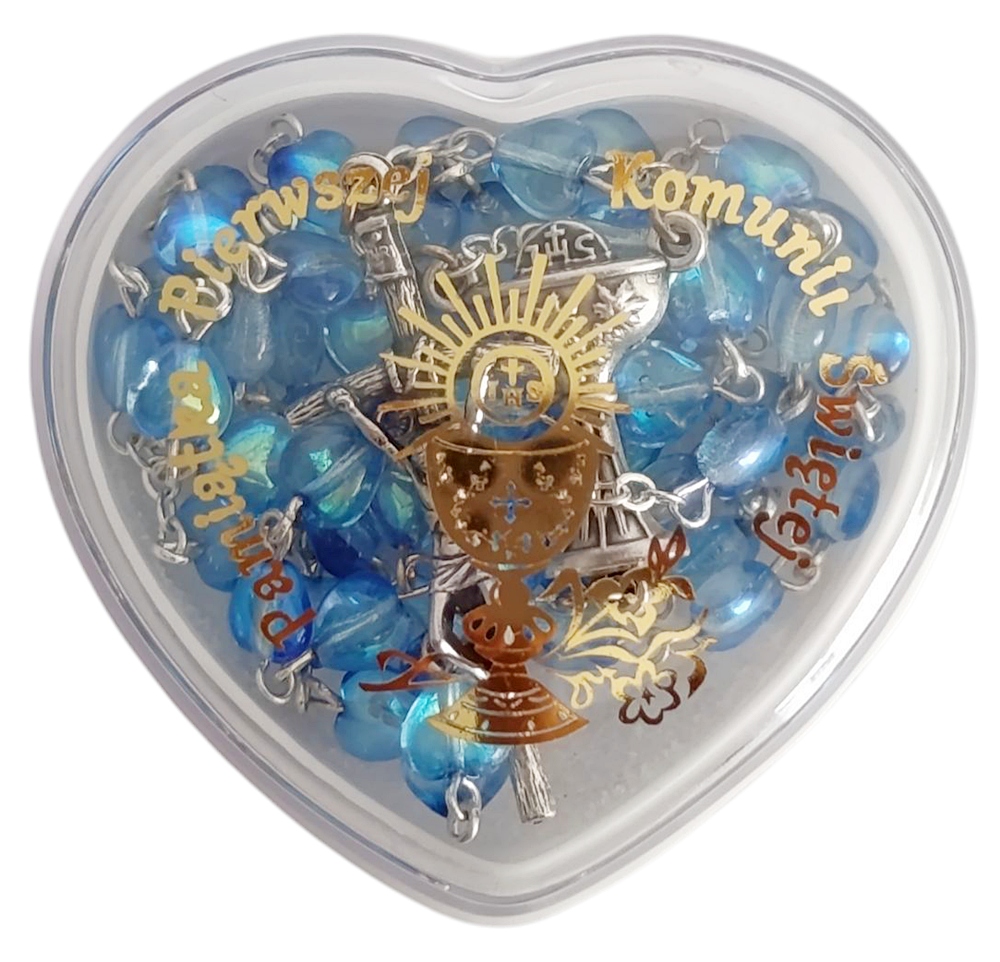 Красиво -выглядящий Розарий помещается в коробку в форме сердца с золотой чашкой IHS и надписью «Сувенир первого святого причастия».
